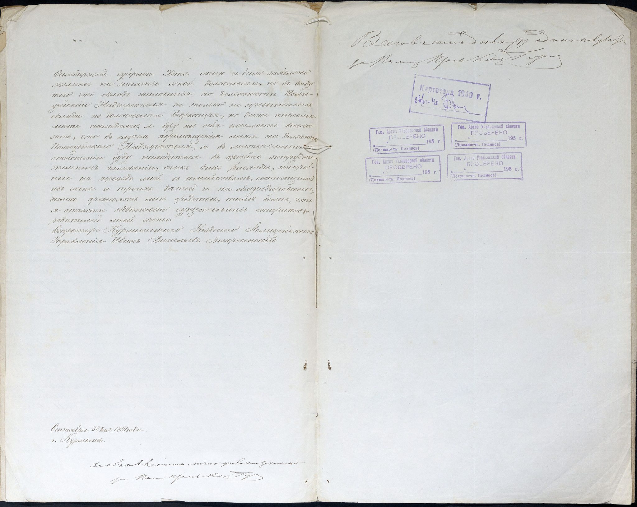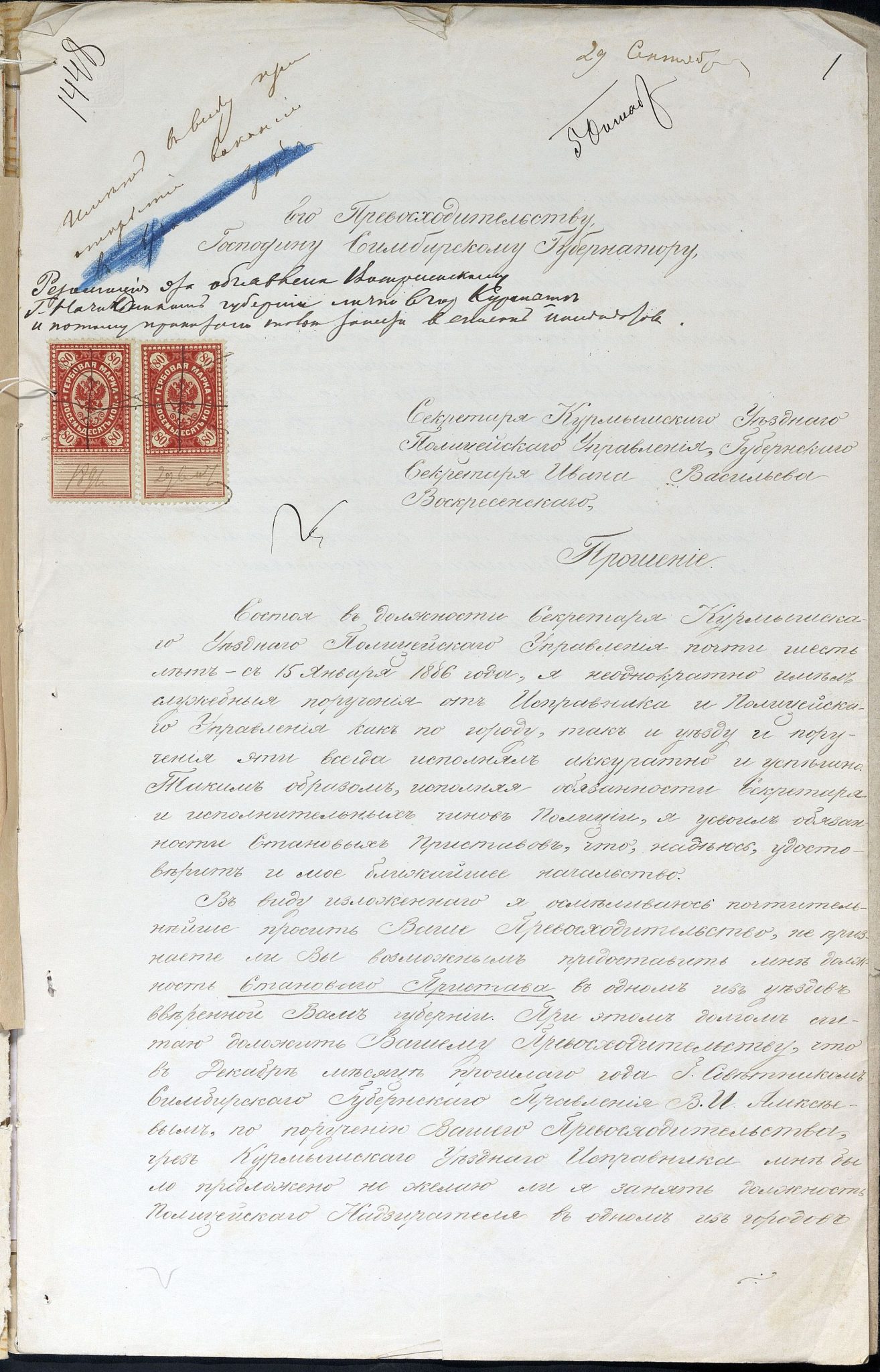 Ввиду изложенного я осмеливаюсь почтительнейше просить Ваше Превосходительство, не признаете ли Вы возможность предоставить мне должность Станового Пристава в одном из уездов вверенной Вам губернии. При этом долгом считаю доложить Вашему Превосходительству, что в декабре месяце прошлого года Г. Советником Симбирского Уездного Правления В. И Алексеевым, по поручению Вашего Превосходительства, чрез Курмышского Уездного Исправника мне было предложено, не желаю ли я занять должность Полицейского Надзирателя в одном из городов Симбирской губернии. Хотя мною и было заявлено желание на занятие этой должности, но ввиду того, что оклад жалования по должности Полицейского Надзирателя не только не превышает оклада по должности Секретаря, но даже несколько менее последнего, я беру на себя смелость высказать, что в случае перемещения меня на должность Полицейского Надзирателя я в материальном отношении буду находиться в крайне затруднительном положении, так как расходы, потребные на переезд мой с семейством, состоящем из жены и троих детей, и на обмундирование, далеко превысят мои средства, тем более, что я отчасти обеспечиваю существование стариков-родителей моей жены.