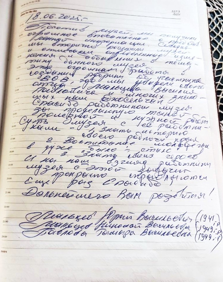 «Посетив музей, мы получили огромное впечатление от представленной информации. Сегодня мы вторично посетили музей и отмечаем определённые изменения и добавления в тематику данного музея. Это огромная работа в создании рубрики о об участниках ВОВ, где мы увидели своего отца – Мальцева Василия Павловича и многих знакомых нам односельчан.