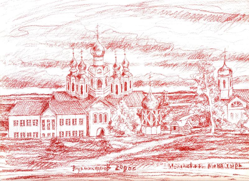 Вид Медянского Покровского монастыря (со старинного паломнического листа). Рисунок Максима Бурмистрова.