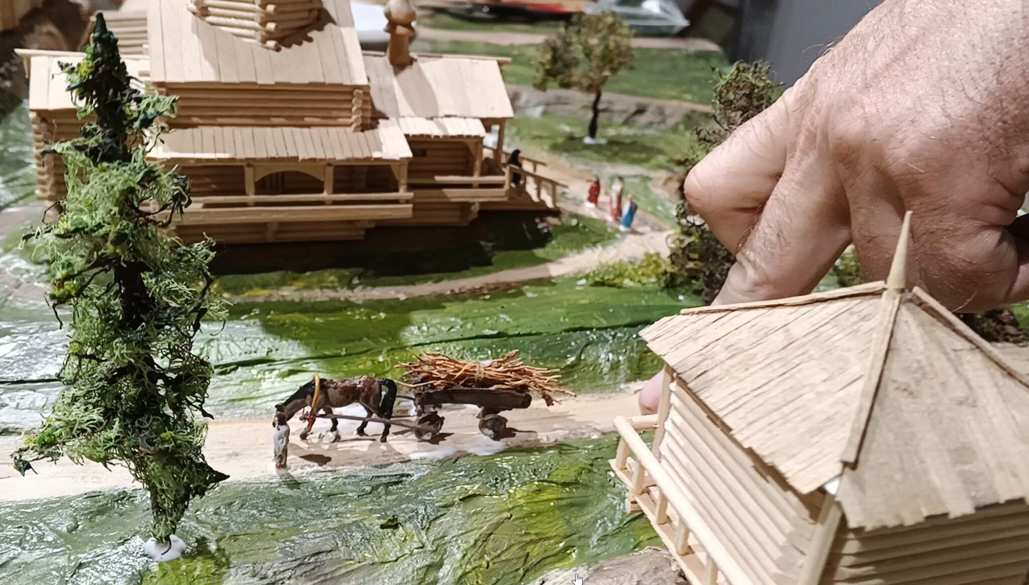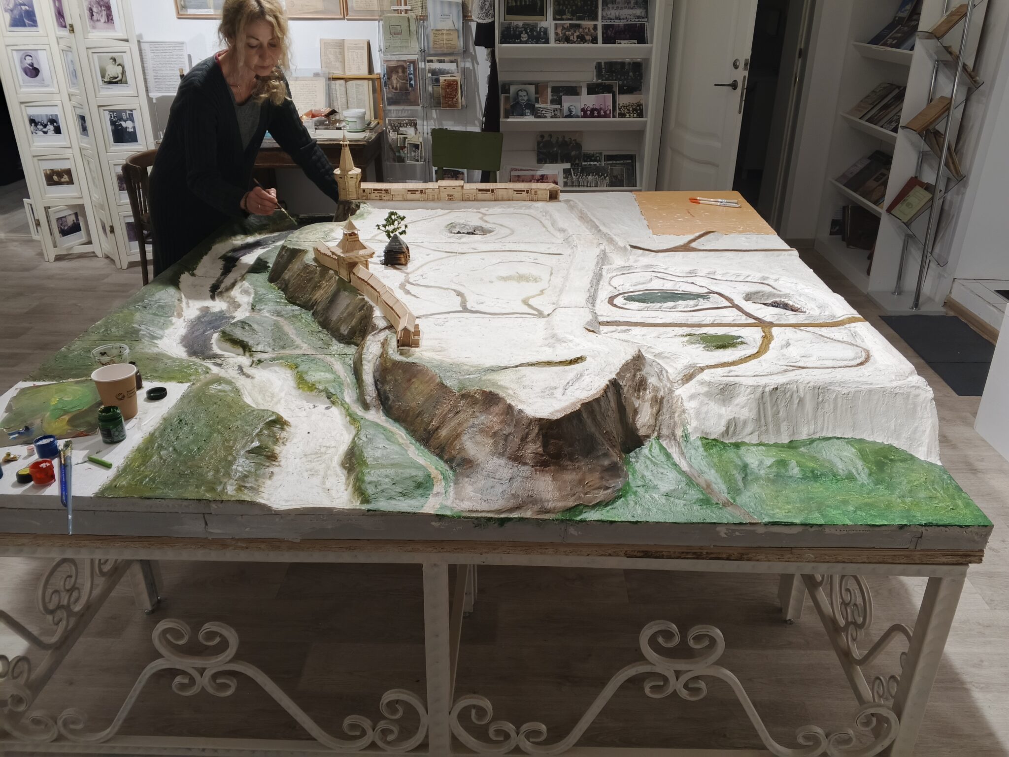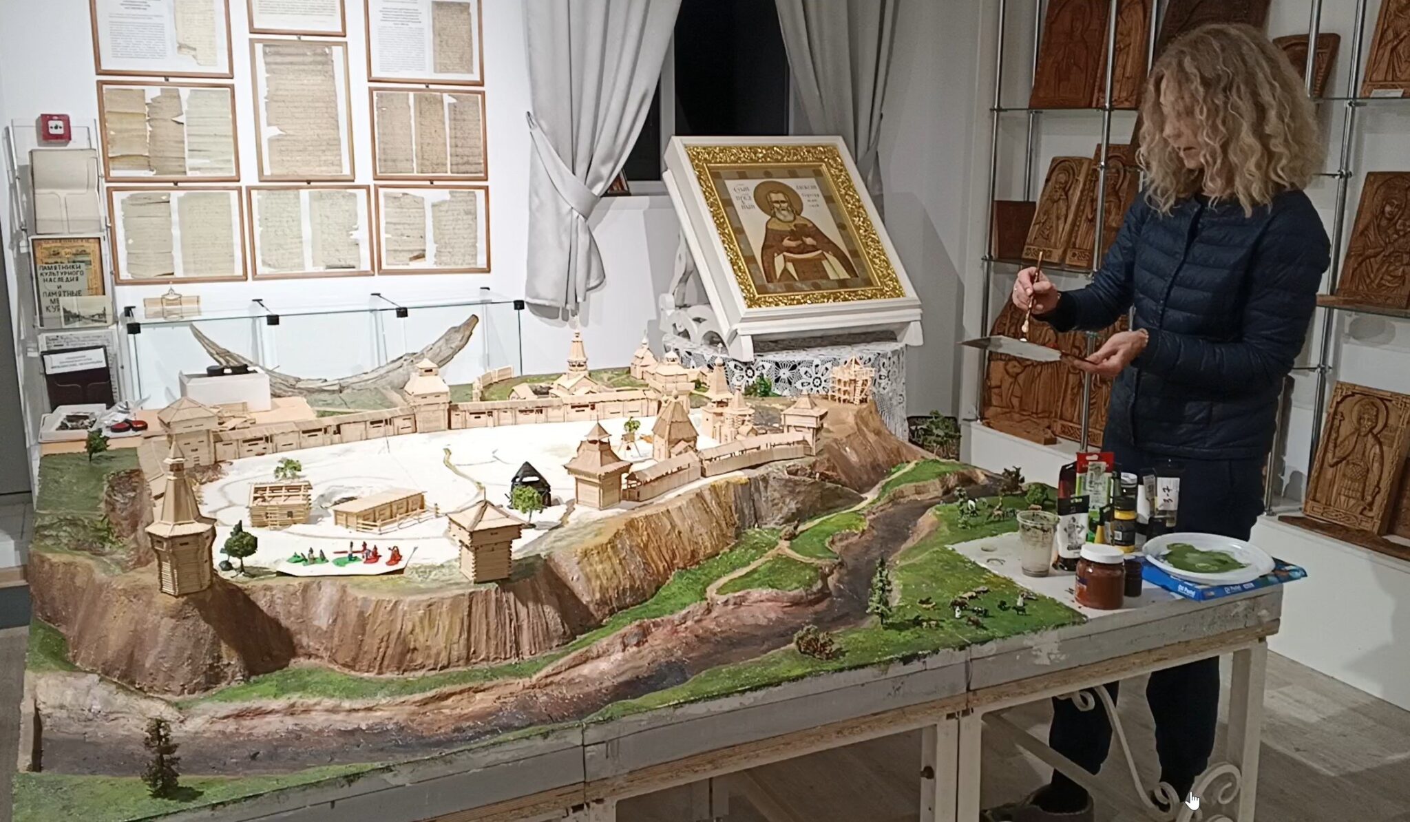 К августу ландшафт был покрыт текстурной пастой, настал последний этап – покраска, заливка эпоксидной смолой водоёмов и создание растительности. И вот, целыми днями мы пишем гигантскую акриловую картину – насыпи, дорожки, травушку и прочую красоту. Нашей музейной хранительнице Ирине Даниловой досталась покраска коровушек. лошадей и прочей живности. Вчера начали «сажать» кустики и деревья, готовимся к самому интересному: сегодня-завтра возьмёмся за сотворение воды.