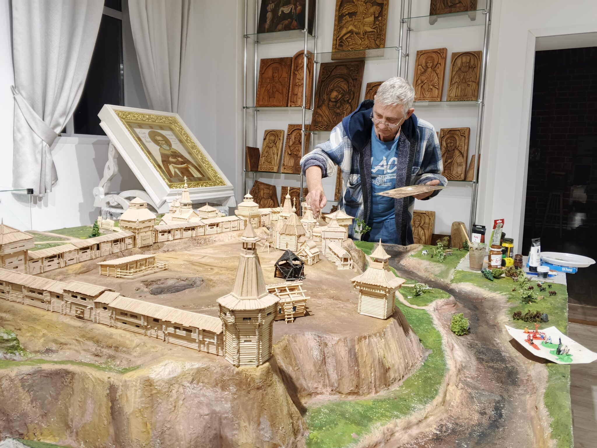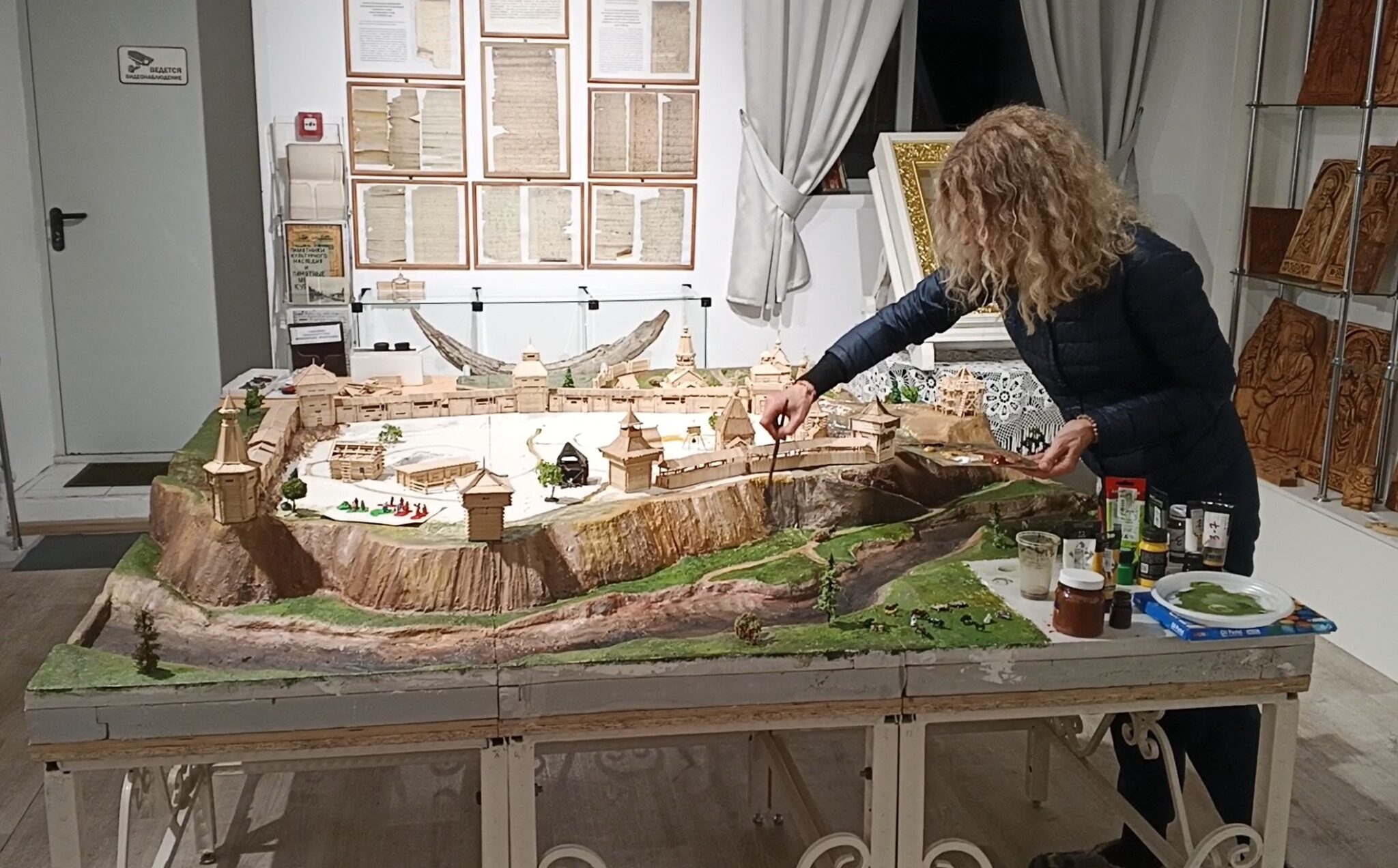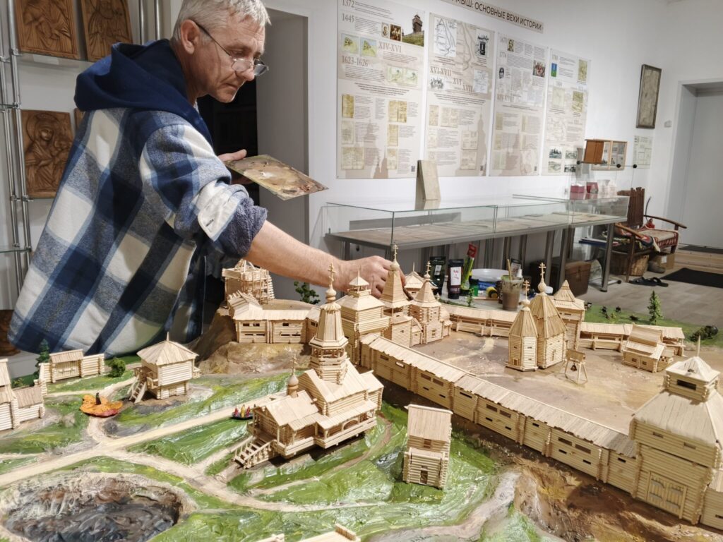 С конца августа Александрина Вигилянская с Евгением Палачёвым почти ежедневно колдуют над макетом старинного Курмыша, работа над которым была начата ещё полтора года назад. Написав проект для грантового конкурса Президентского фонда культурных инициатив и пообещав воссоздать в миниатюре старинную курмышскую крепость и Богородице-Рождественский монастырь на посаде для Курмышского краеведческого музея, наша команда, не дожидаясь итогов конкурса, взялась за дело. Евгений – за изготовление башен и храмов Курмыша периода XVI века, Александрина – за фигурки жителей, монахов, стрельцов и за всякую мелочовку.