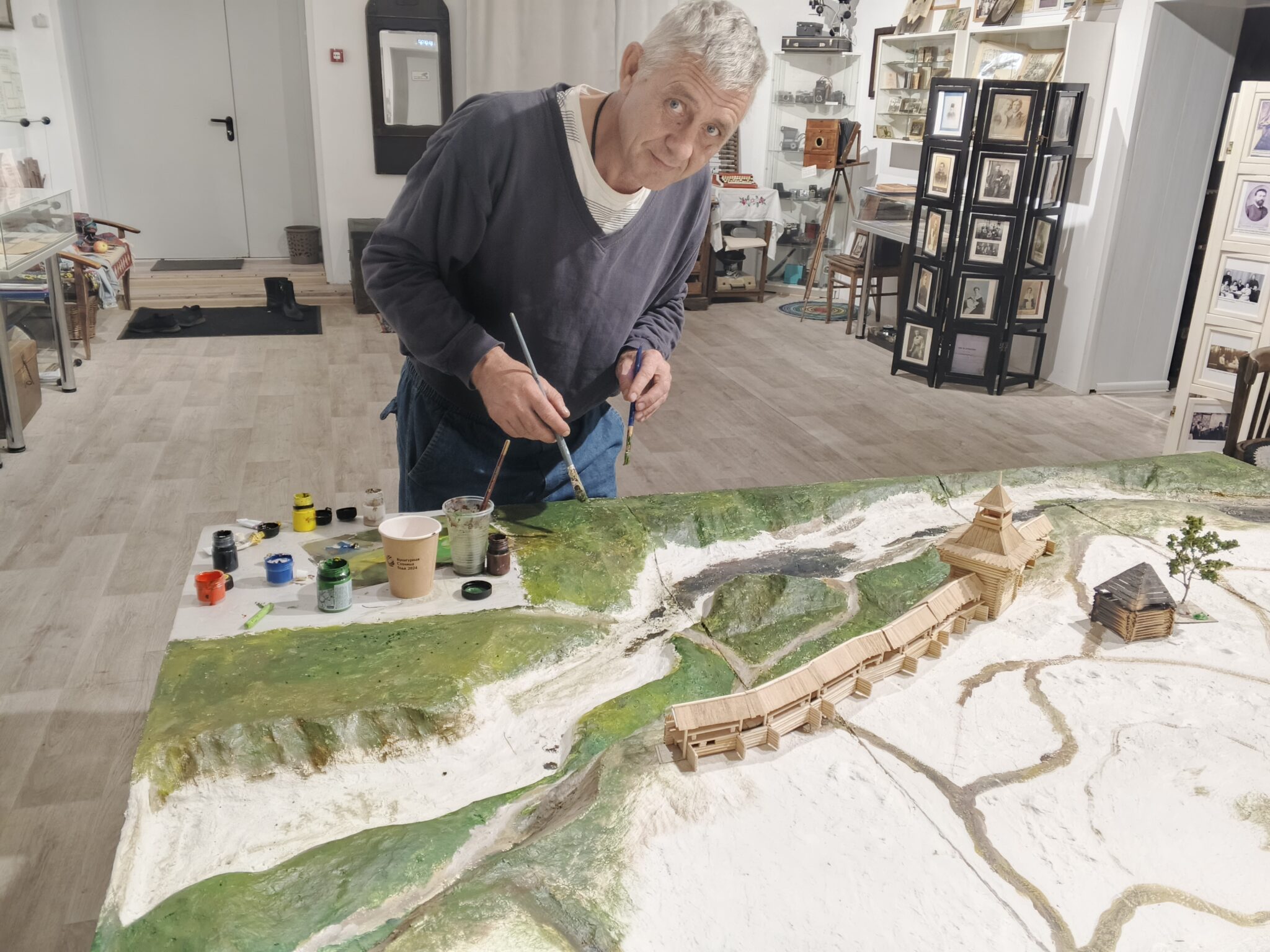Летом 2024 года мы узнали о победе нашего проекта «Семь веков курмышской истории: горизонты памяти», а значит обратного пути у нас уже не осталось: никуда не денешься, надо создавать макет в масштабе 1:100, размером 190х190 см. На протяжении года Евгений конструировал постройки – крепостную ограду, 8 башен, 4 храма клетского типа, опираясь на описания Писцовой книги Курмыша 1623–1626 гг. и исторические исследования. Этим летом Евгений взялся за основу макета – фактурный рельеф местности, с Сурой и водоёмами, рвами, валами и лугами за крепостной оградой.