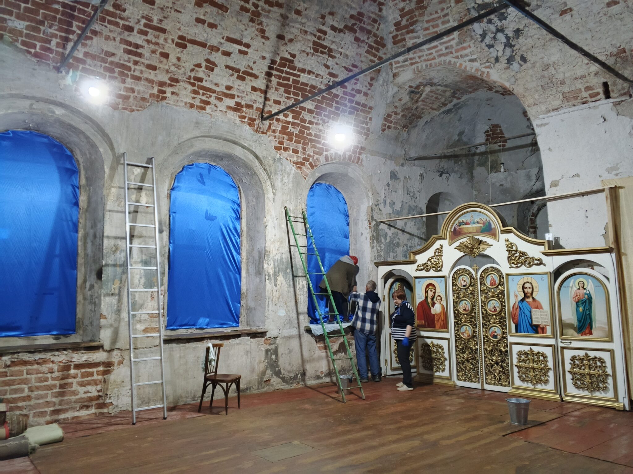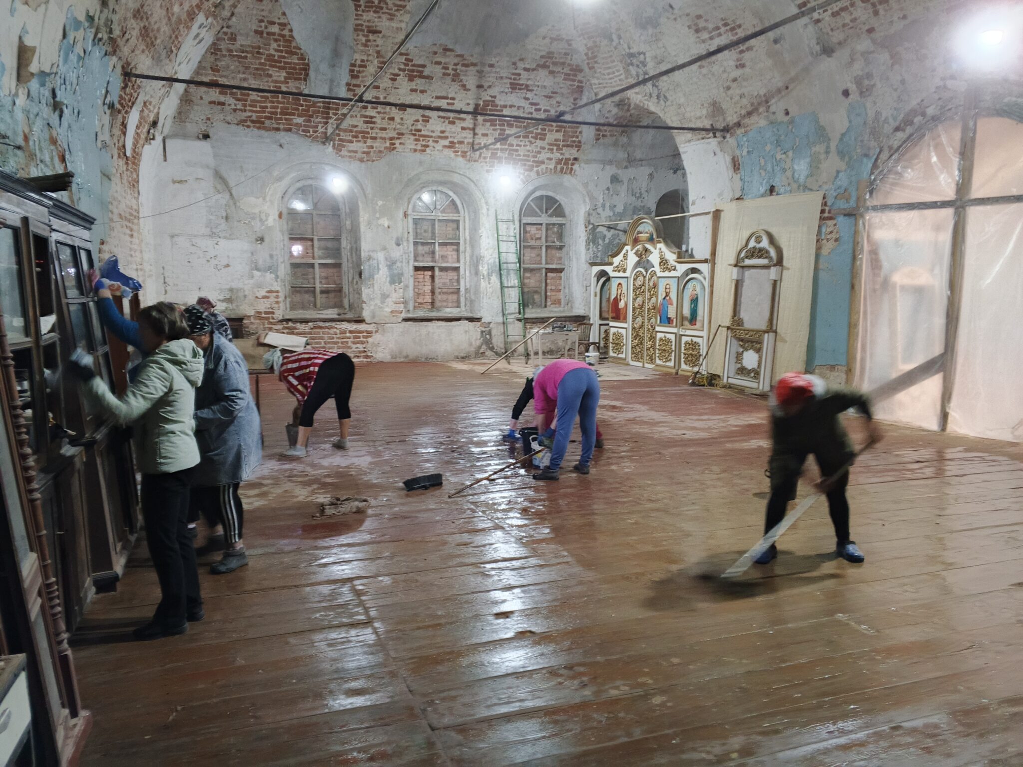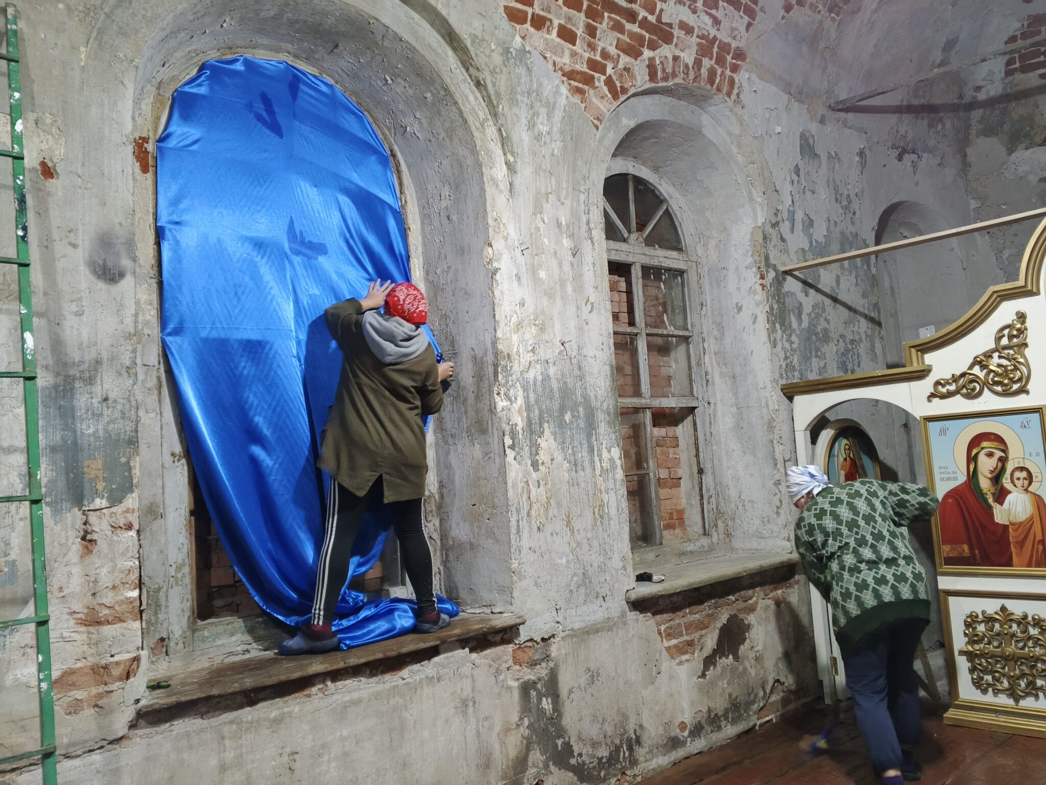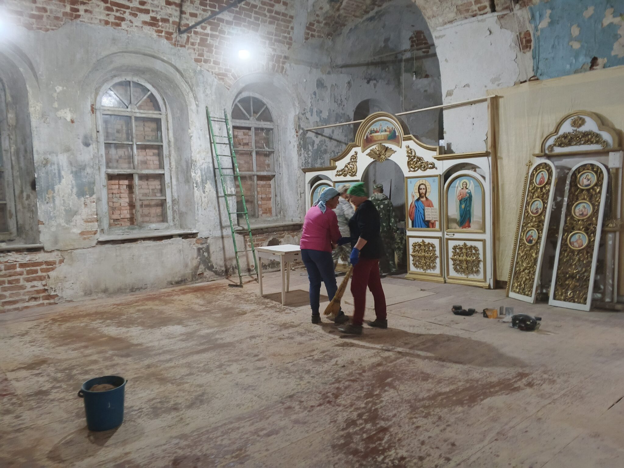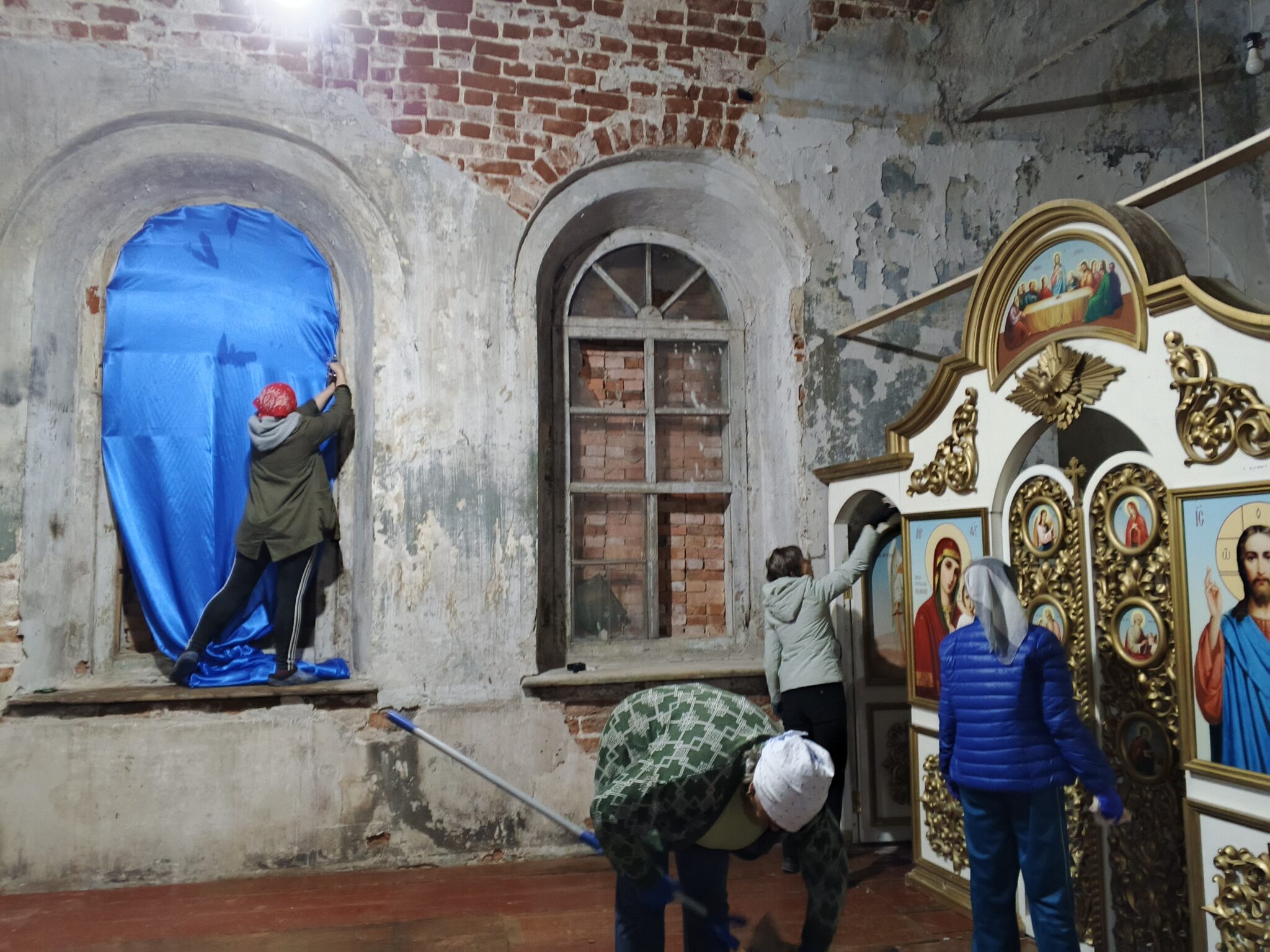 На подмогу мужчинам вскоре подоспели и женщины – мели, тёрли, мыли полы, распятие, иконы, все поверхности, изгоняли нечистоты, тачками вывозили мусор и опять чистили, мыли, наводили красоту. Неприглядные места на стенах и на замурованных в советское время окнах – там, где скоро появятся иконы – задрапировали ярко-синей «богородичной» тканью.