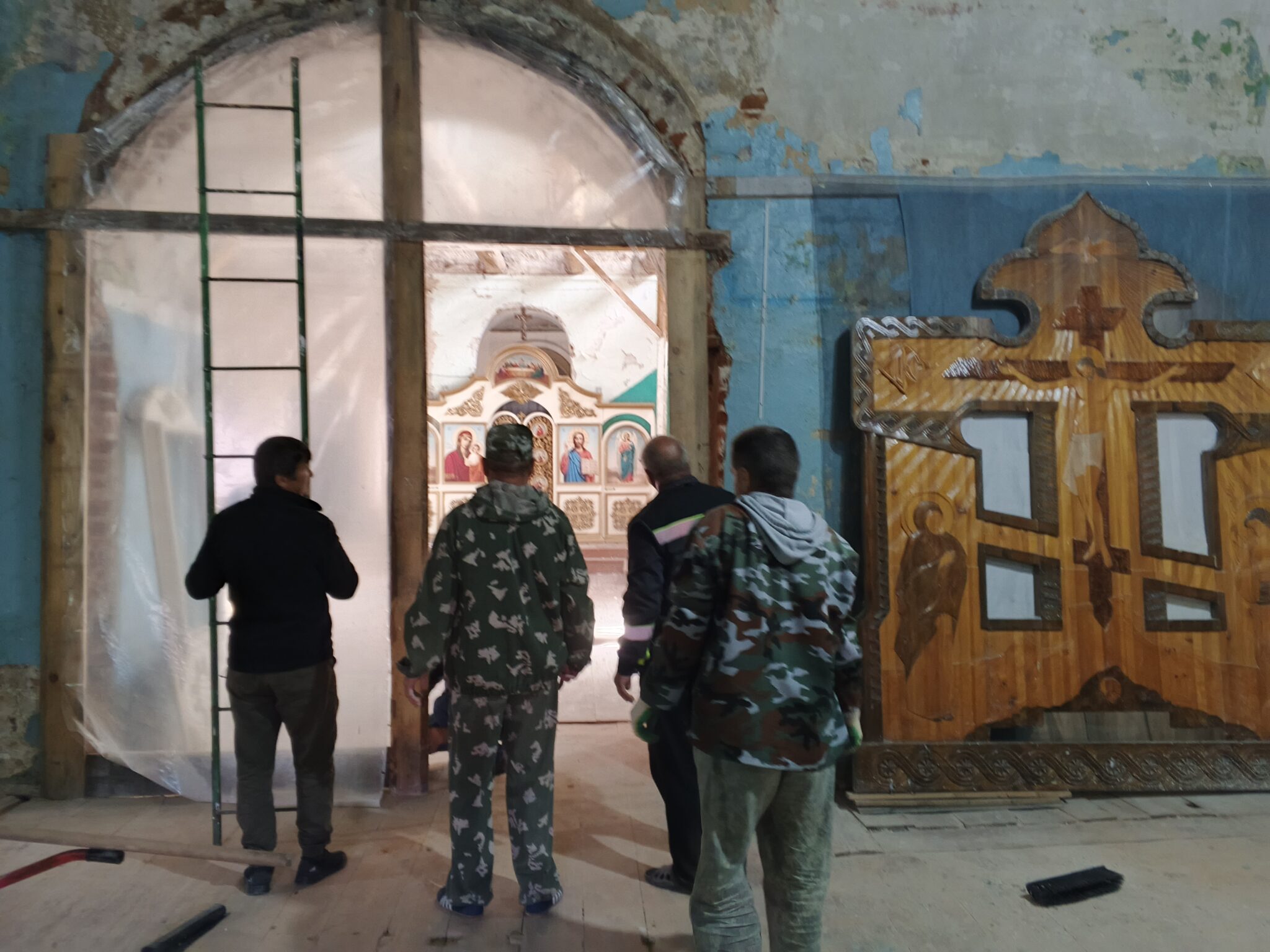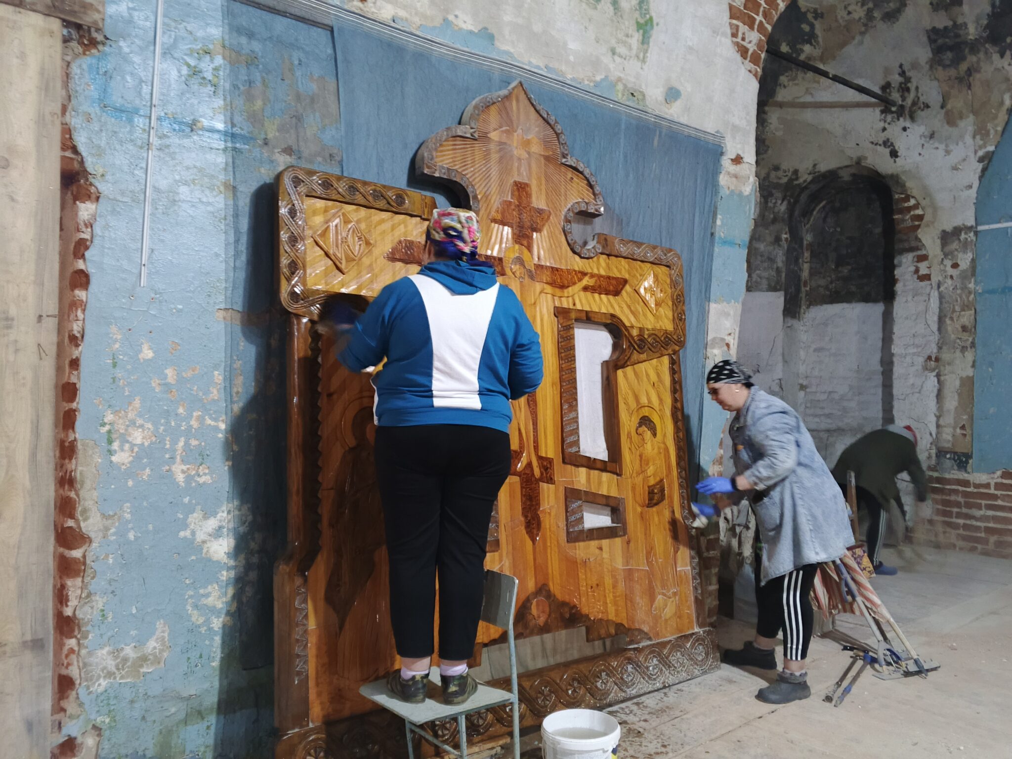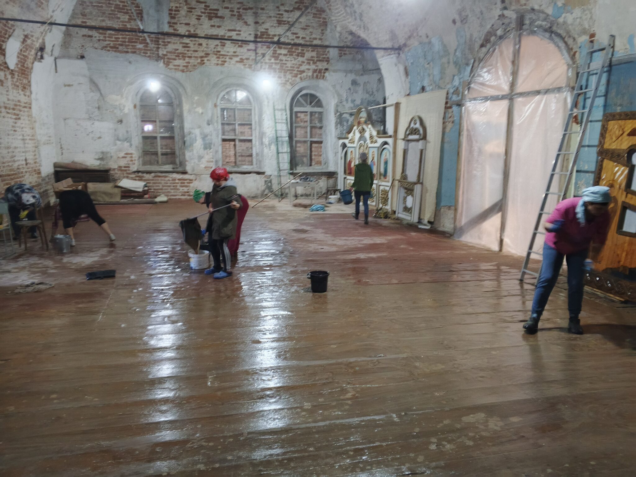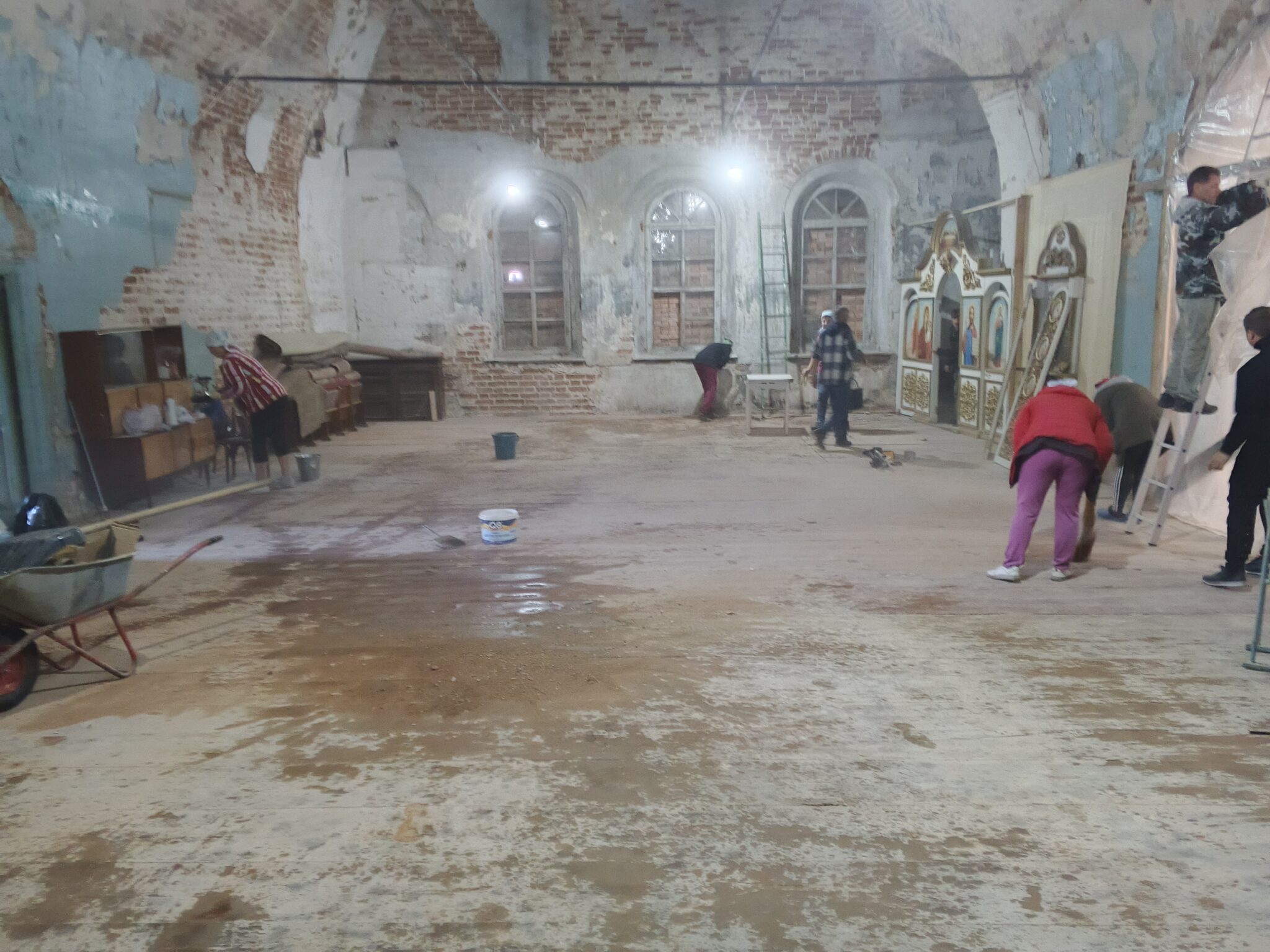 На подмогу мужчинам вскоре подоспели и женщины – мели, тёрли, мыли полы, распятие, иконы, все поверхности, изгоняли нечистоты, тачками вывозили мусор и опять чистили, мыли, наводили красоту. Неприглядные места на стенах и на замурованных в советское время окнах – там, где скоро появятся иконы – задрапировали ярко-синей «богородичной» тканью.