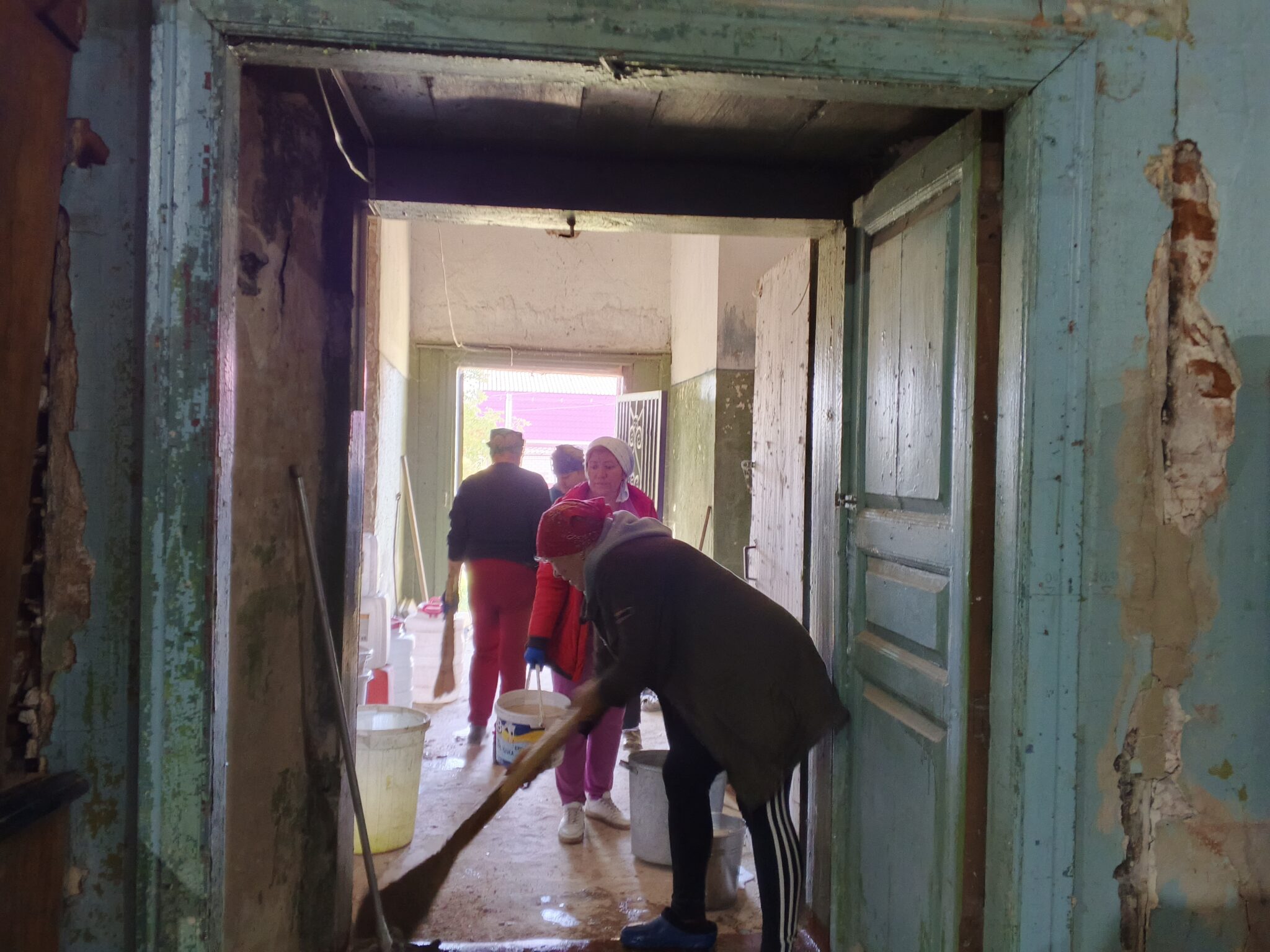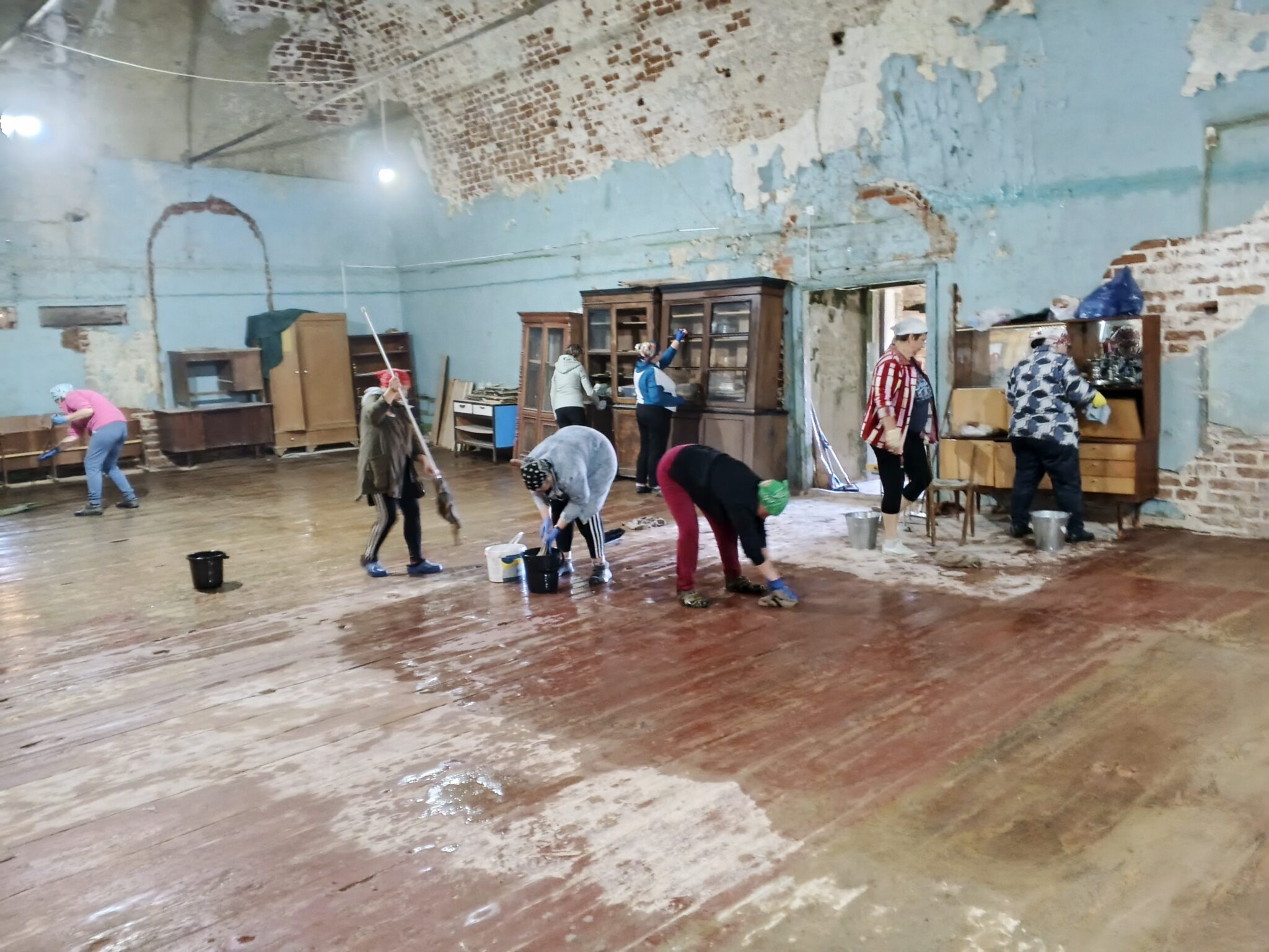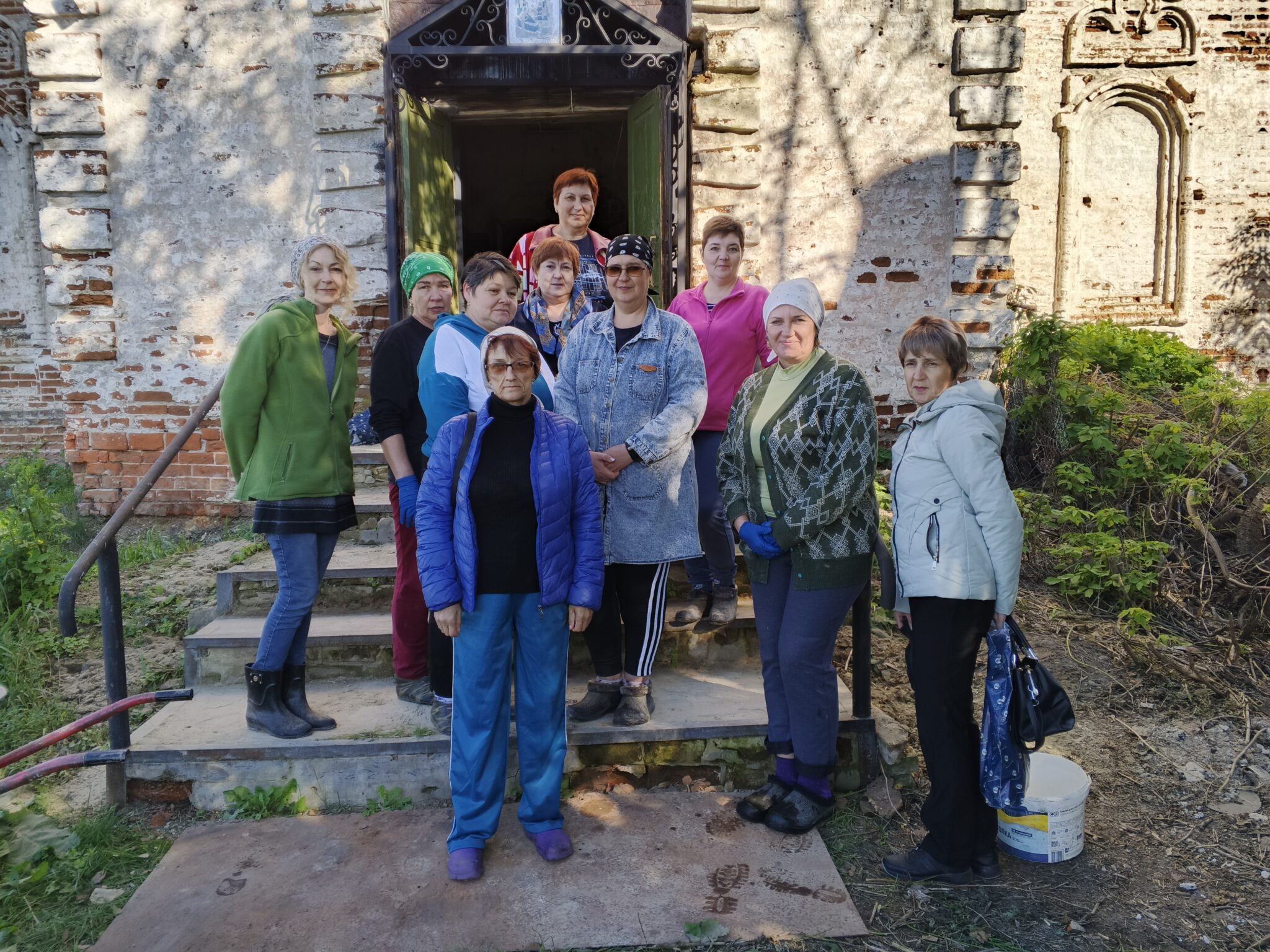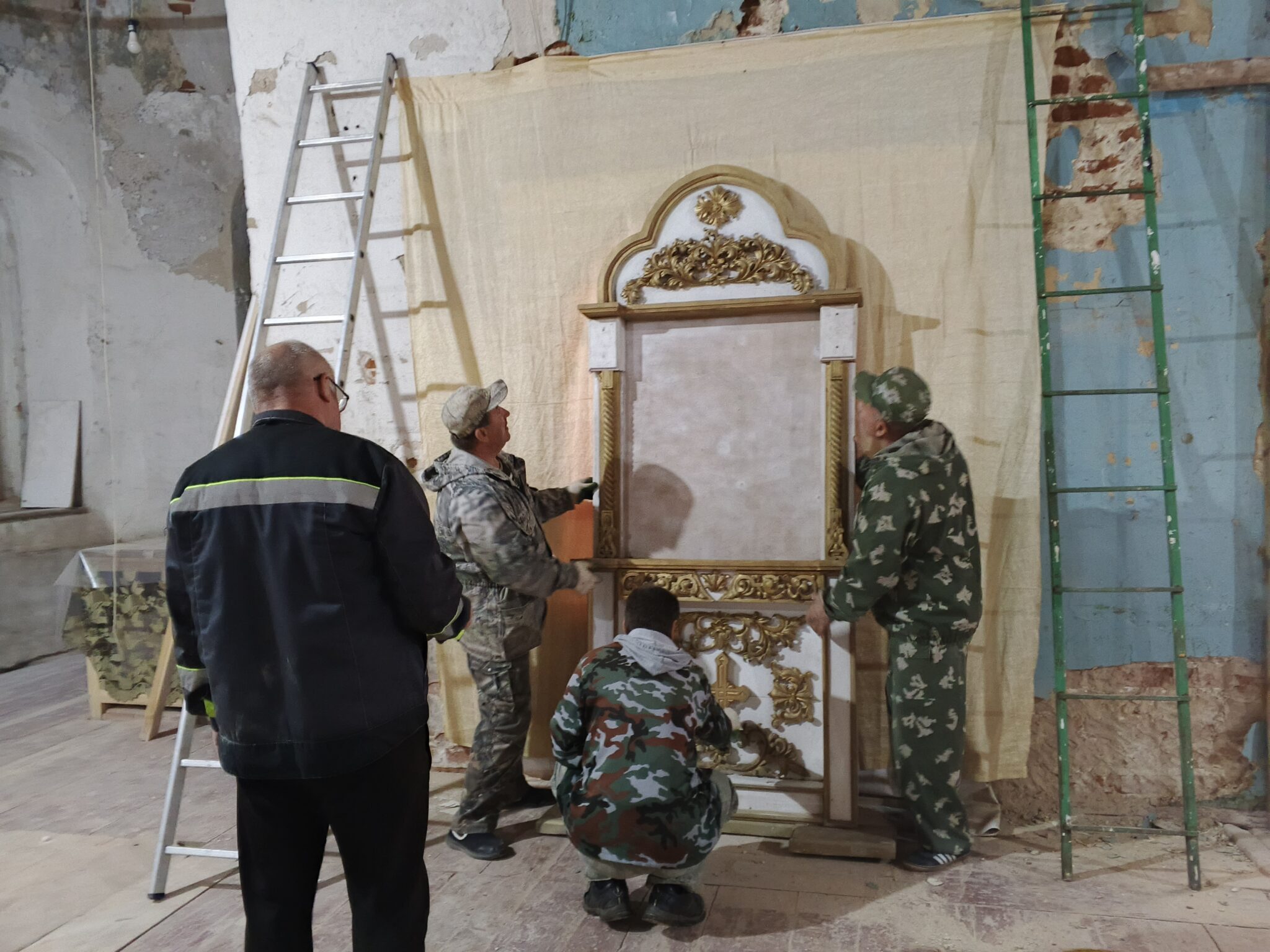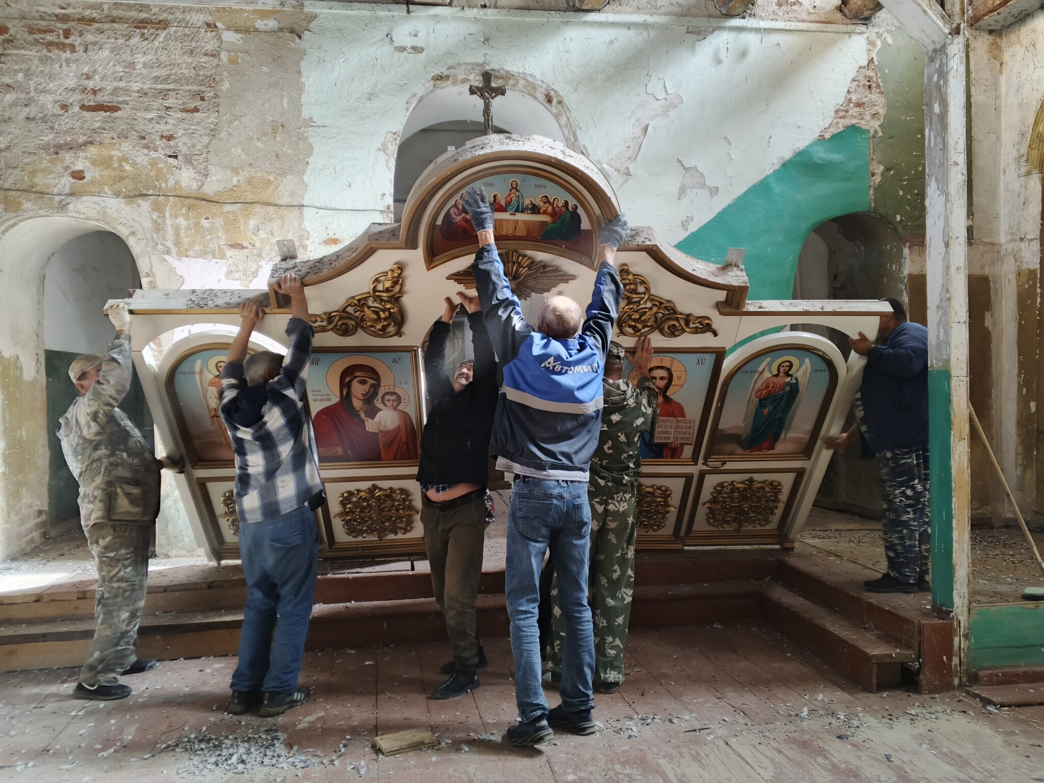 На подмогу мужчинам вскоре подоспели и женщины – мели, тёрли, мыли полы, распятие, иконы, все поверхности, изгоняли нечистоты, тачками вывозили мусор и опять чистили, мыли, наводили красоту. Неприглядные места на стенах и на замурованных в советское время окнах – там, где скоро появятся иконы – задрапировали ярко-синей «богородичной» тканью.
