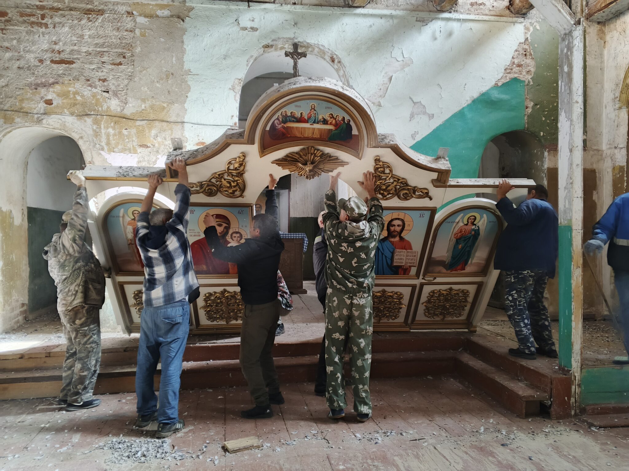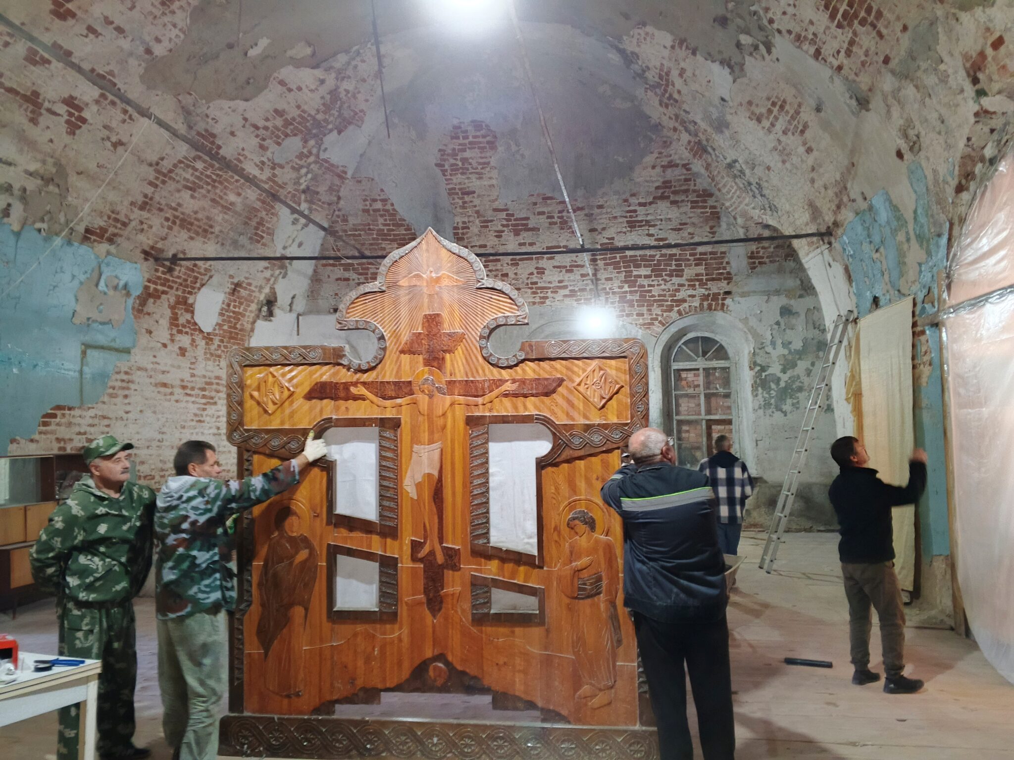 Сначала появились мужчины – настоящие богатыри. Предстояло натаскать воды, наладить освещение в храме и перенести ооочень тяжёлые распятие и иконостас – и не просто перенести, но ещё и установить в приделе Всех Святых, придумав и оборудовав сложную конструкцию из деревянных стоек.