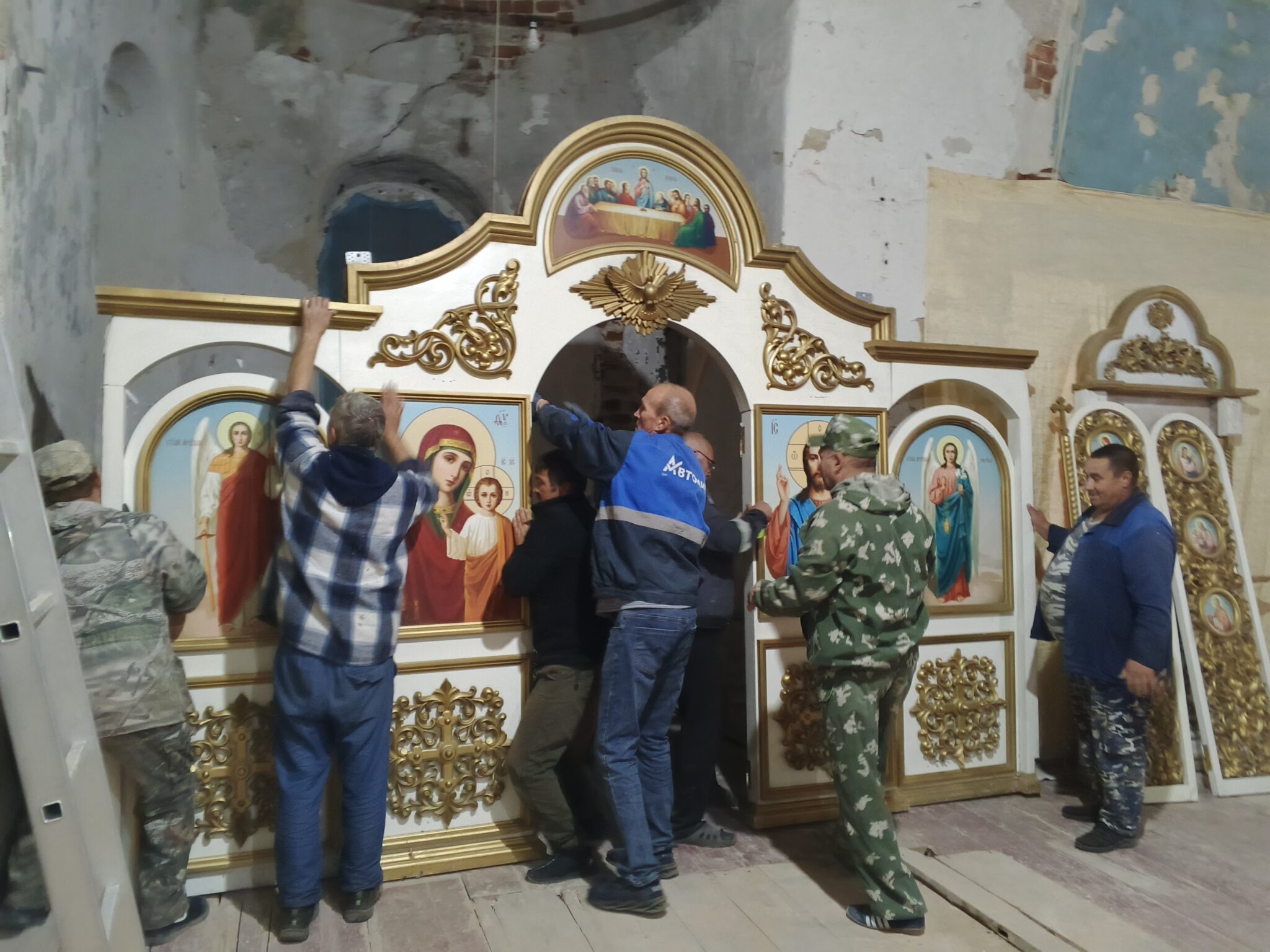 Иконостас несли всемером! Установили и большой киот для драгоценной храмовой иконы Рождества Пресвятой Богородицы, которая скоро вернётся в храм из вынужденного заточения в нашем хранилище.