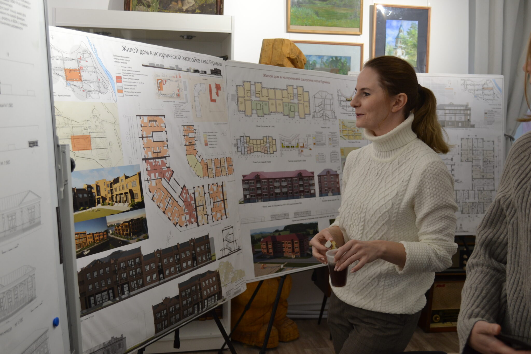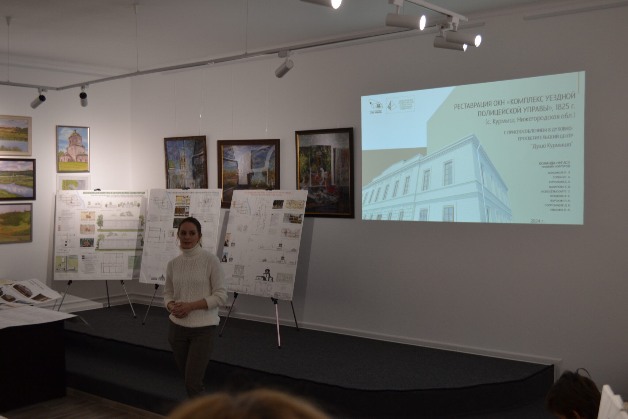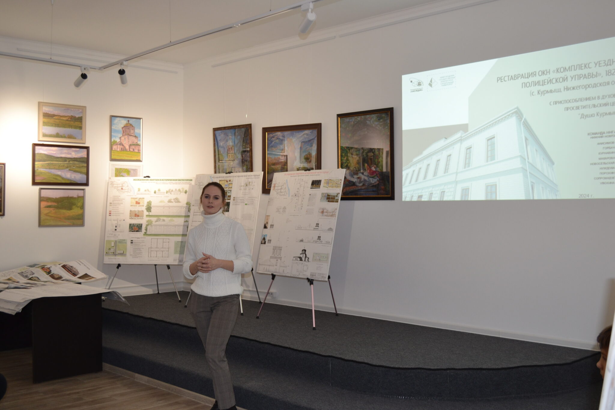 Главные герои торжества – нижегородские студенты – посетили в Курмыше места своих исследований для уточнения и прояснения некоторых исследовательских вопросов, а потом выступили перед собравшимися с докладами о результатах своей работы. Руководитель студенческих проектов – кандидат архитектуры, доцент кафедры истории архитектуры и основ архитектурного проектирования ННГАСУ Дарья Хмелевская – представила проекты ребят и рассказала об итогах многолетних исследований в Курмыше, главным достижением которых стала победа во Всероссийском молодежном конкурсе «Наследие», где студенты завоевали почётное III место за проект «Реставрация ОКН «Комплекс уездной полицейской управы», 1825 г. (село Курмыш, Нижегородская обл.) с приспособлением в духовно-просветительский центр «ДУША КУРМЫША». Кроме того, Институт архитектуры и градостроительства ННГАСУ недавно победил в грантовом конкурсе «Росмолодёжь. Гранты» с проектом «Лаборатория виртуальной реконструкции историко-архитектурного наследия», куда входят и исследования памятников Курмыша.