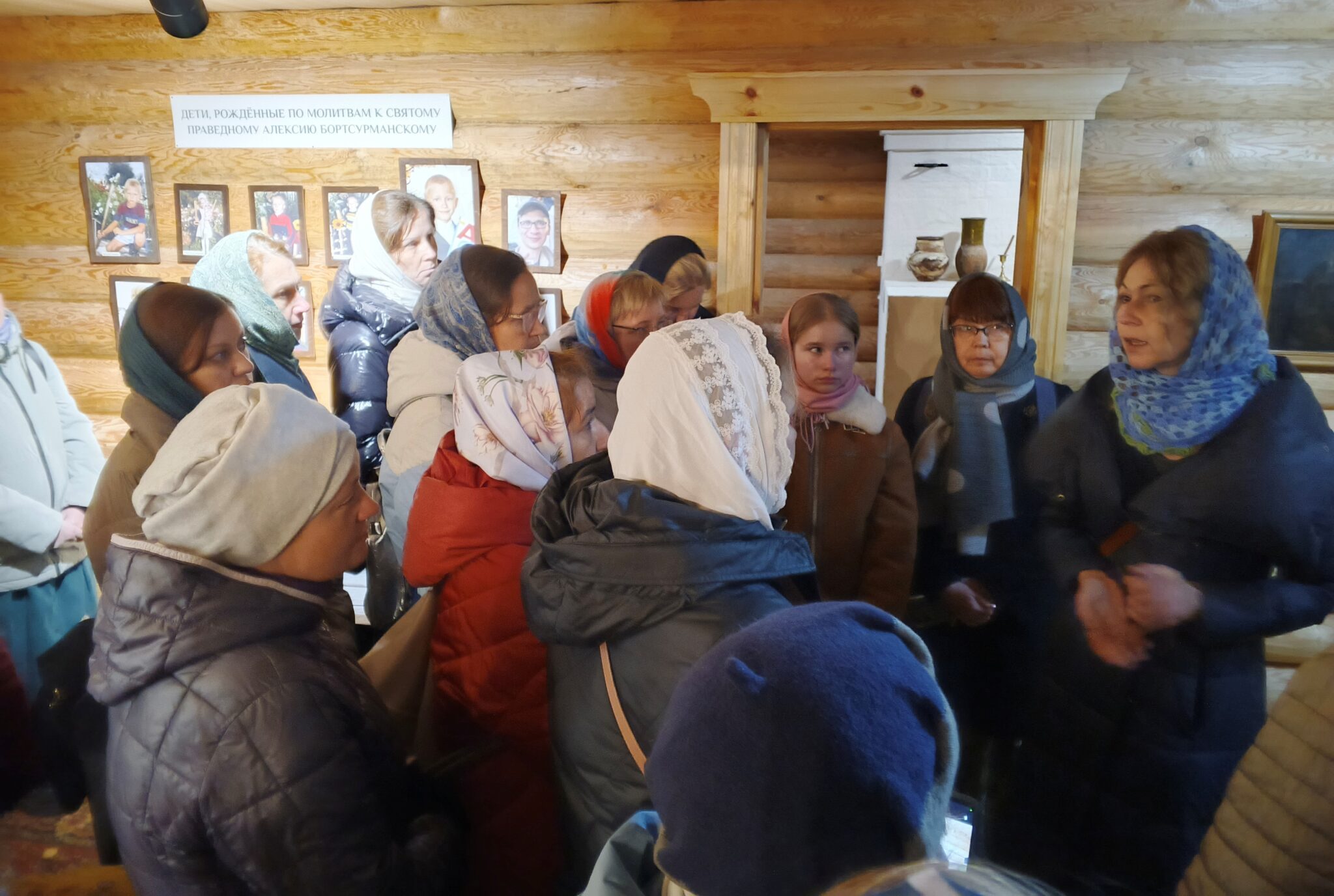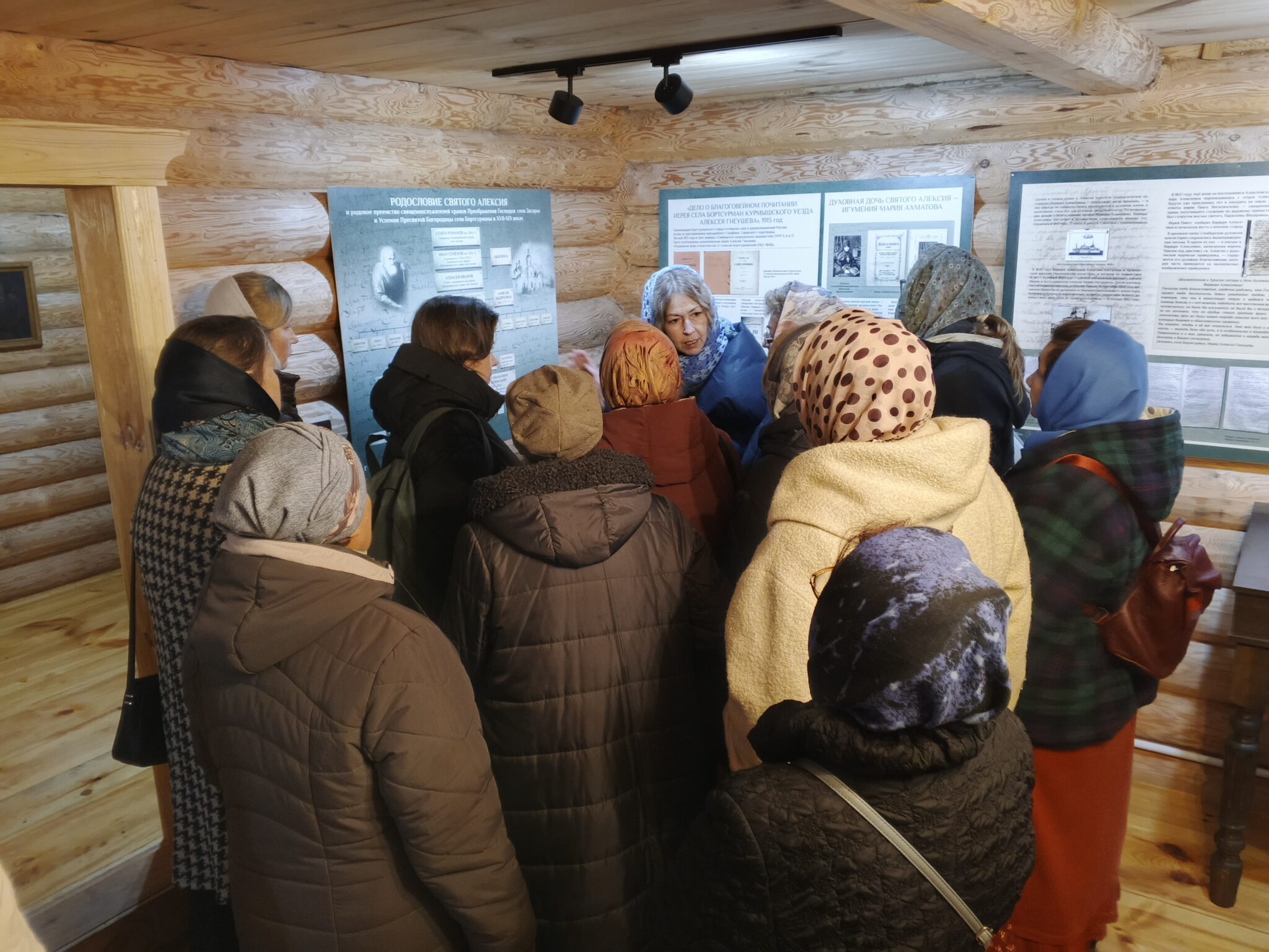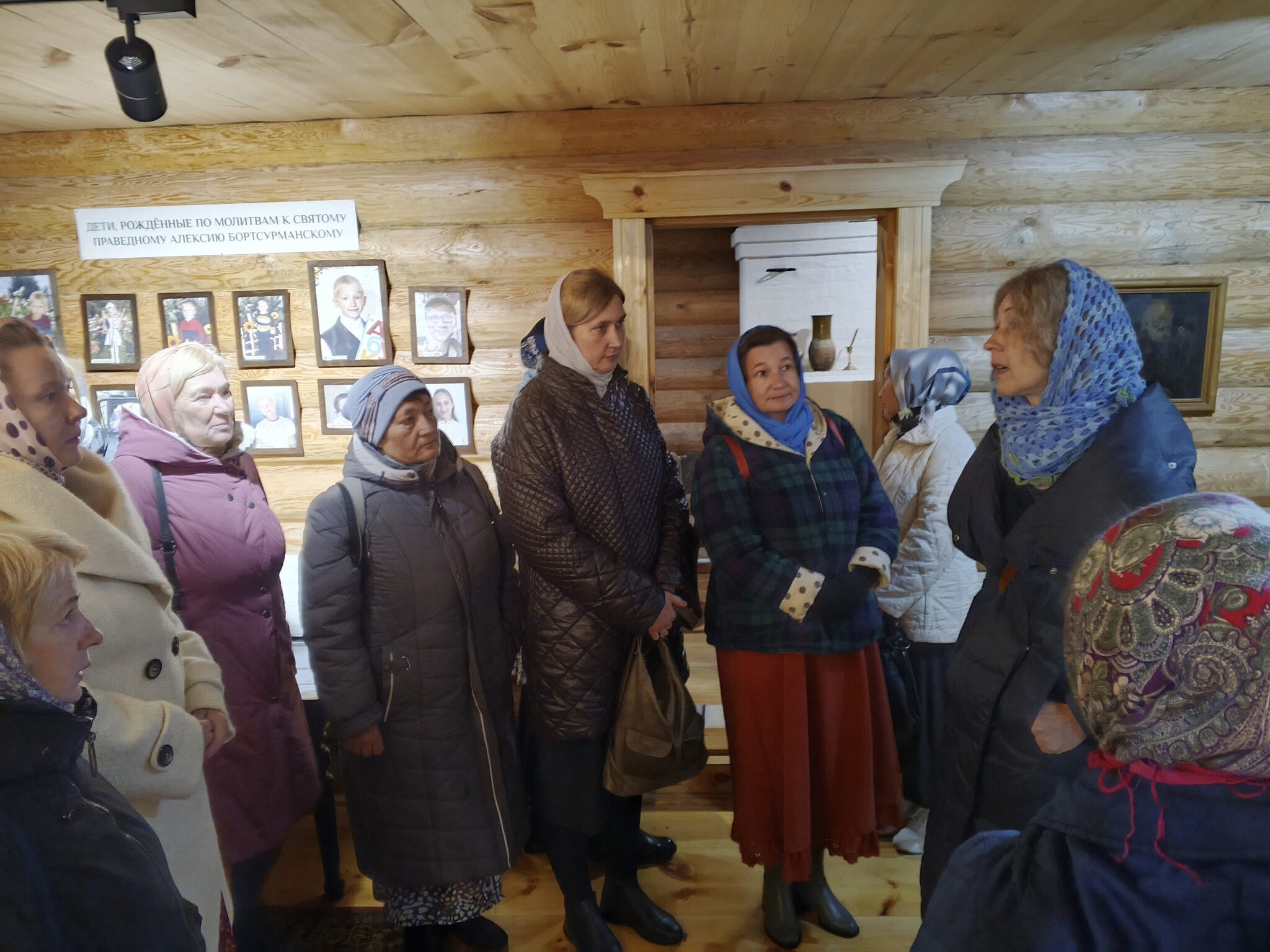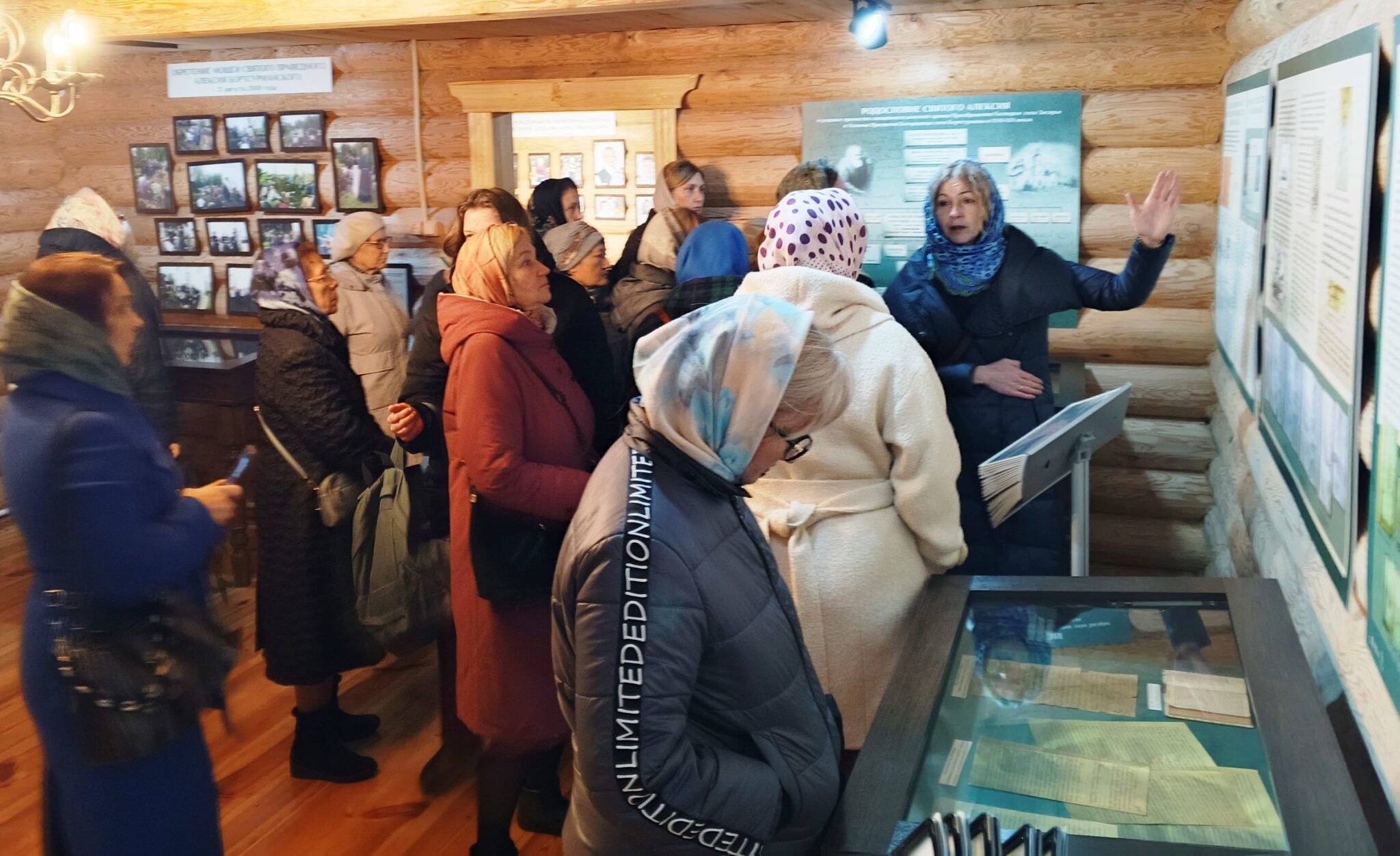 А дальше нашим экскурсоводам – Александрине Владимировне Вигилянской и Елене Павловне Смирновой – предстояло провести для паломников экскурсии по храму и музею праведника. Дело непростое: не каждый день мы принимаем сто человек одновременно. Гостей разделили на две большие группы: пока часть из них трапезничала, другие распределились между матушкой Еленой, пригласившей паломников на уличную экскурсию по истории храма и его священнослужителей с посещением места могилки праведника, и Александриной, принимавшей гостей Доме-музее святого Алексия. Затем группы поменялись местами, а после экскурсий отправились на трапезу. Настал черёд второй половины гостей, которые точно так же по очереди побывали и в музее святого Алексия, и на уличной экскурсии.