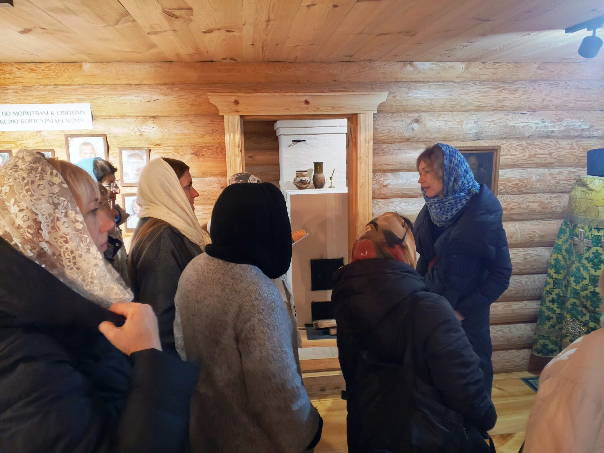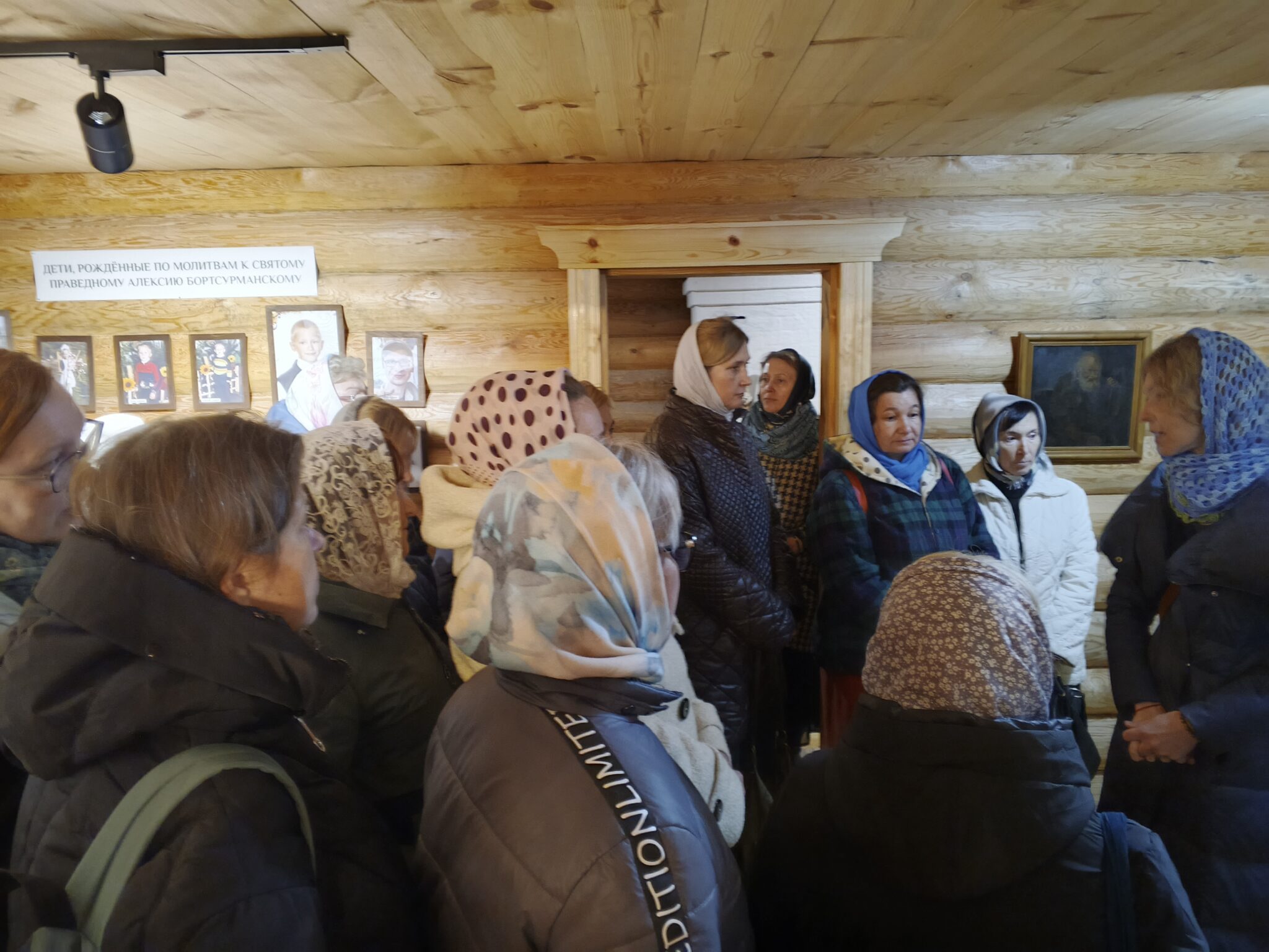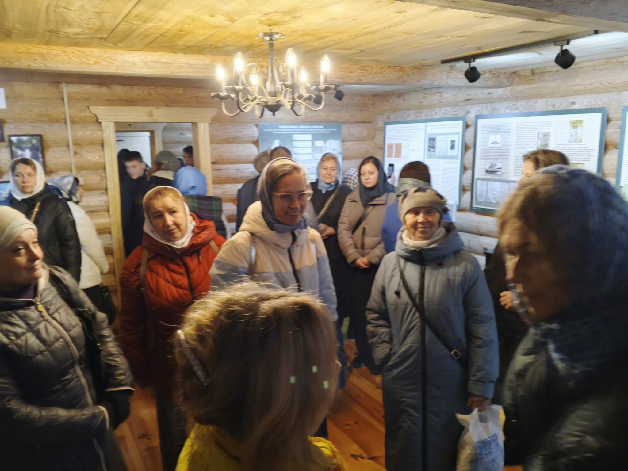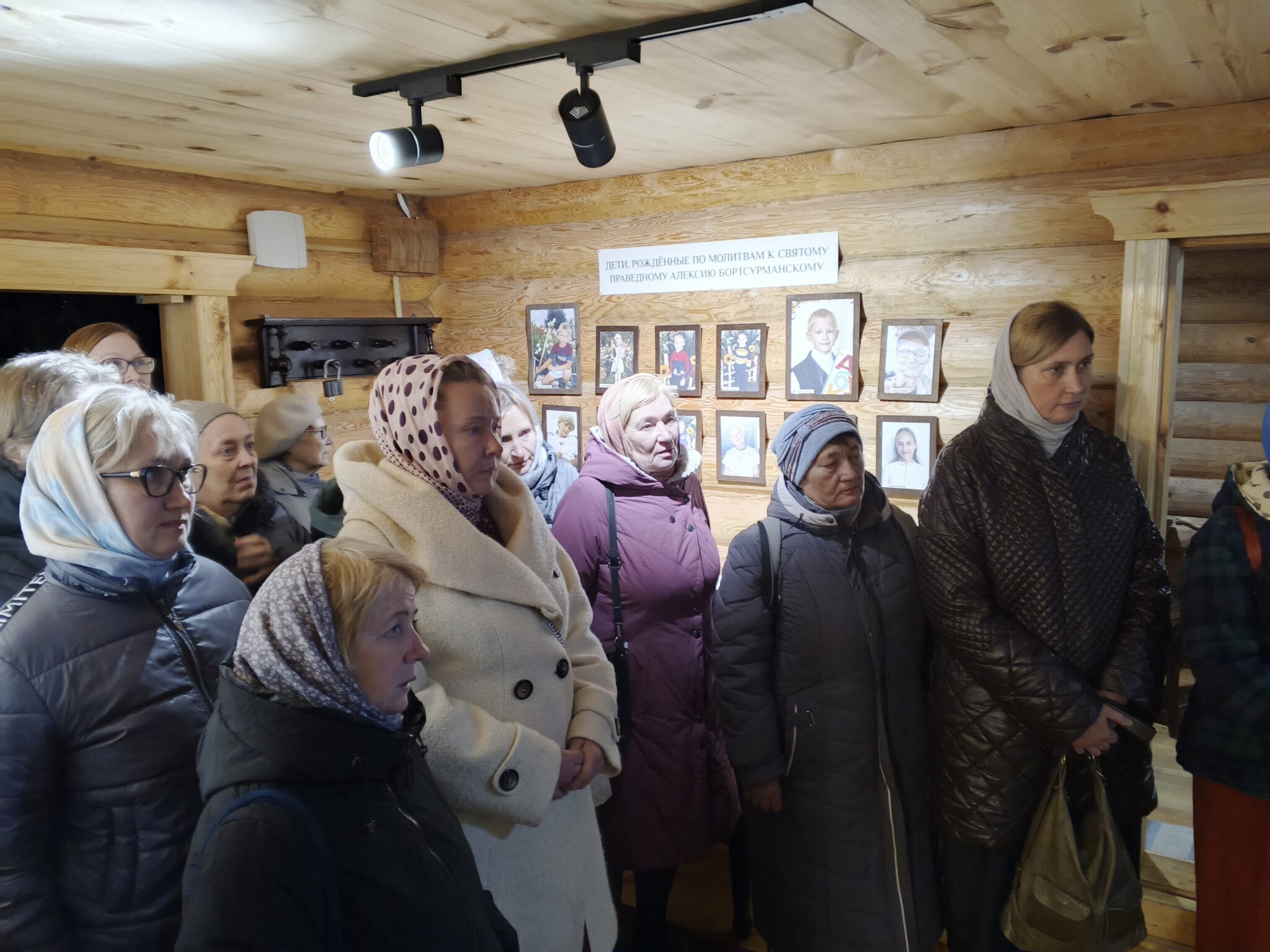 А дальше нашим экскурсоводам – Александрине Владимировне Вигилянской и Елене Павловне Смирновой – предстояло провести для паломников экскурсии по храму и музею праведника. Дело непростое: не каждый день мы принимаем сто человек одновременно. Гостей разделили на две большие группы: пока часть из них трапезничала, другие распределились между матушкой Еленой, пригласившей паломников на уличную экскурсию по истории храма и его священнослужителей с посещением места могилки праведника, и Александриной, принимавшей гостей Доме-музее святого Алексия. Затем группы поменялись местами, а после экскурсий отправились на трапезу. Настал черёд второй половины гостей, которые точно так же по очереди побывали и в музее святого Алексия, и на уличной экскурсии.