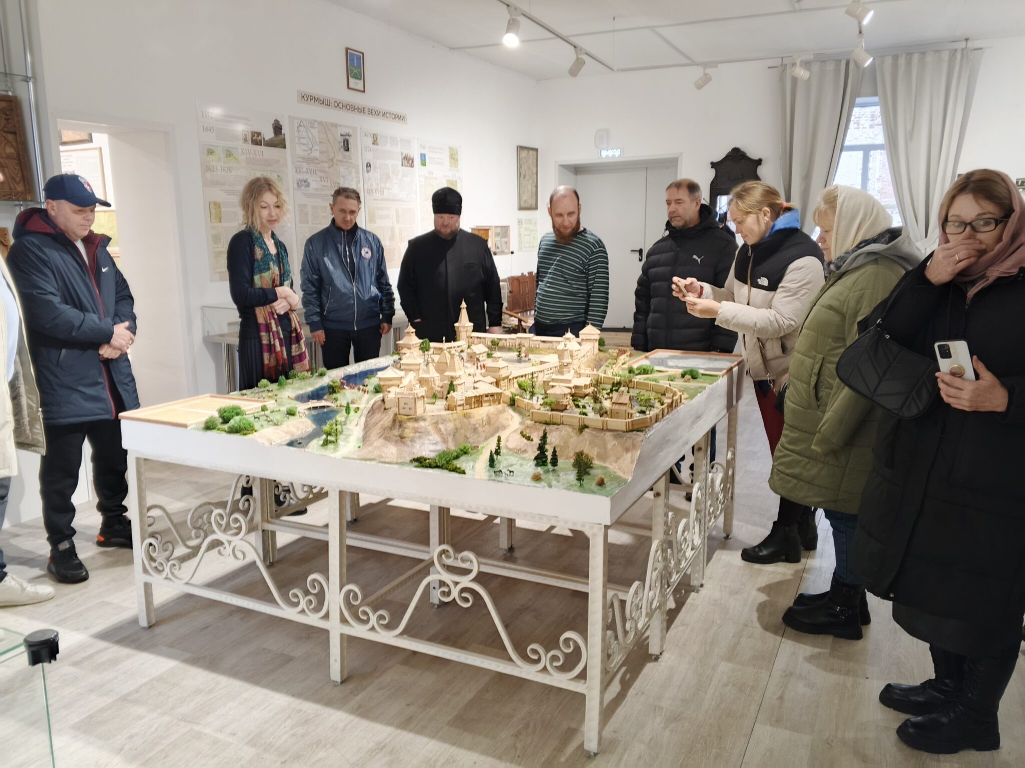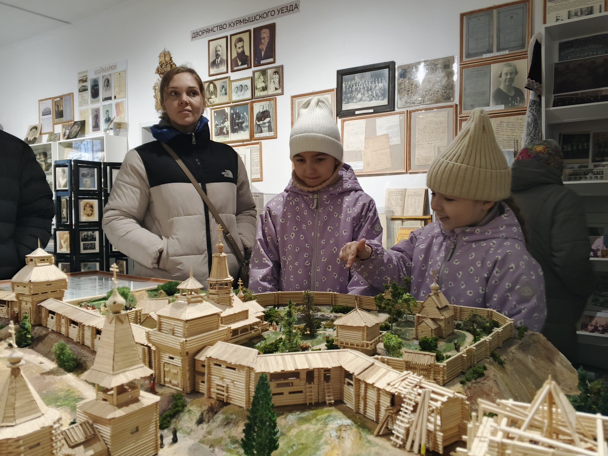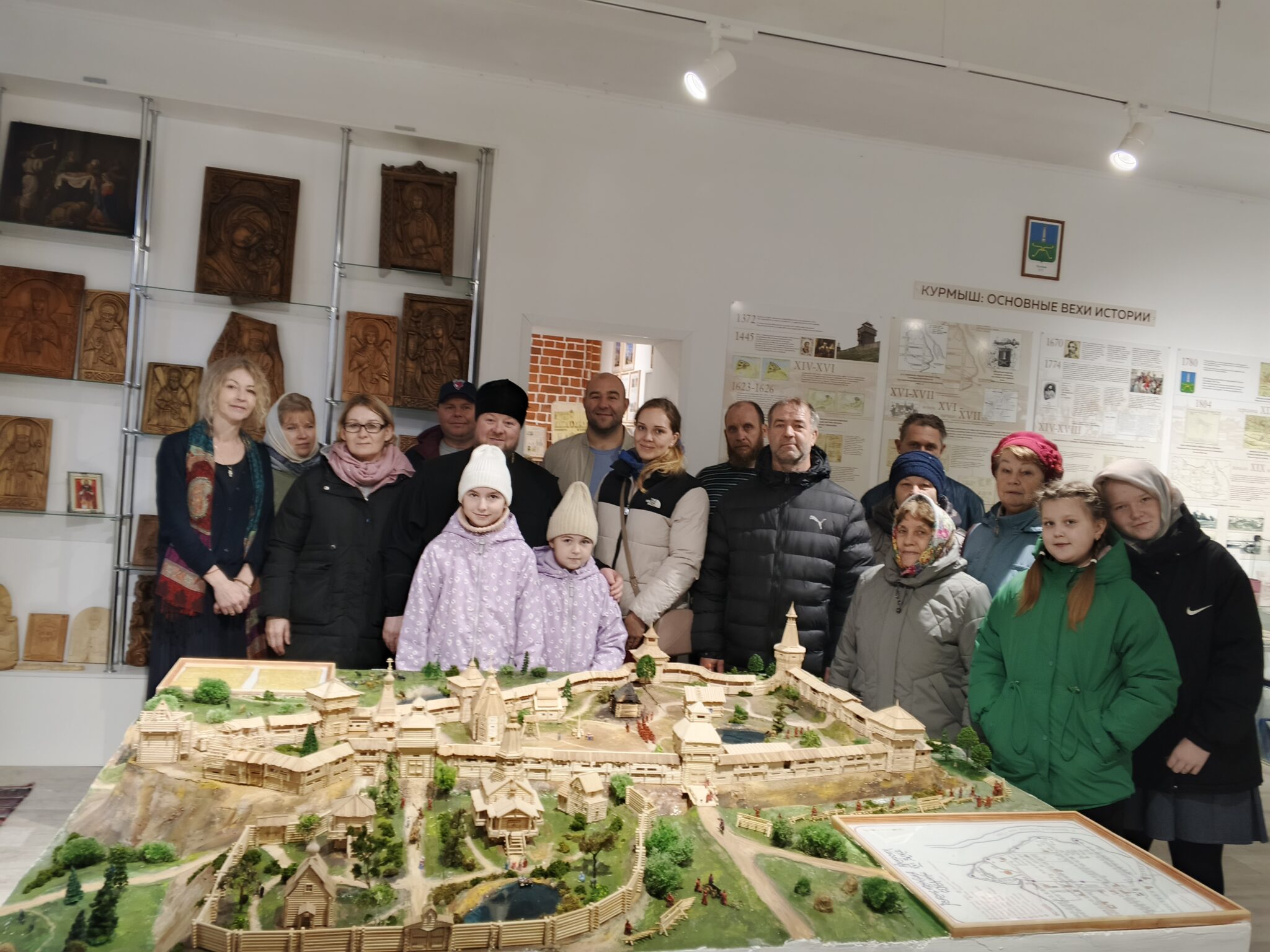 Общение продолжилось в музее, где Александрина Владимировна с Евгением Александровичем Палачёвым в два голоса знакомили посетителей с экспозицией и рукодельными сокровищами – от прекрасных икон курмышского резчика Александра Назарова и картин чебоксарских и нижегородских художников до макета курмышской крепости. Рукотворное чудо курмышского мастера никого не оставило равнодушным, особенно – ребятишек.