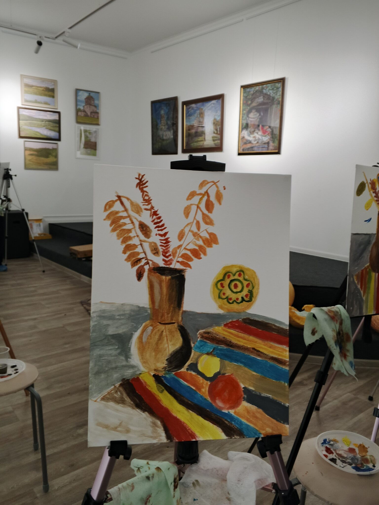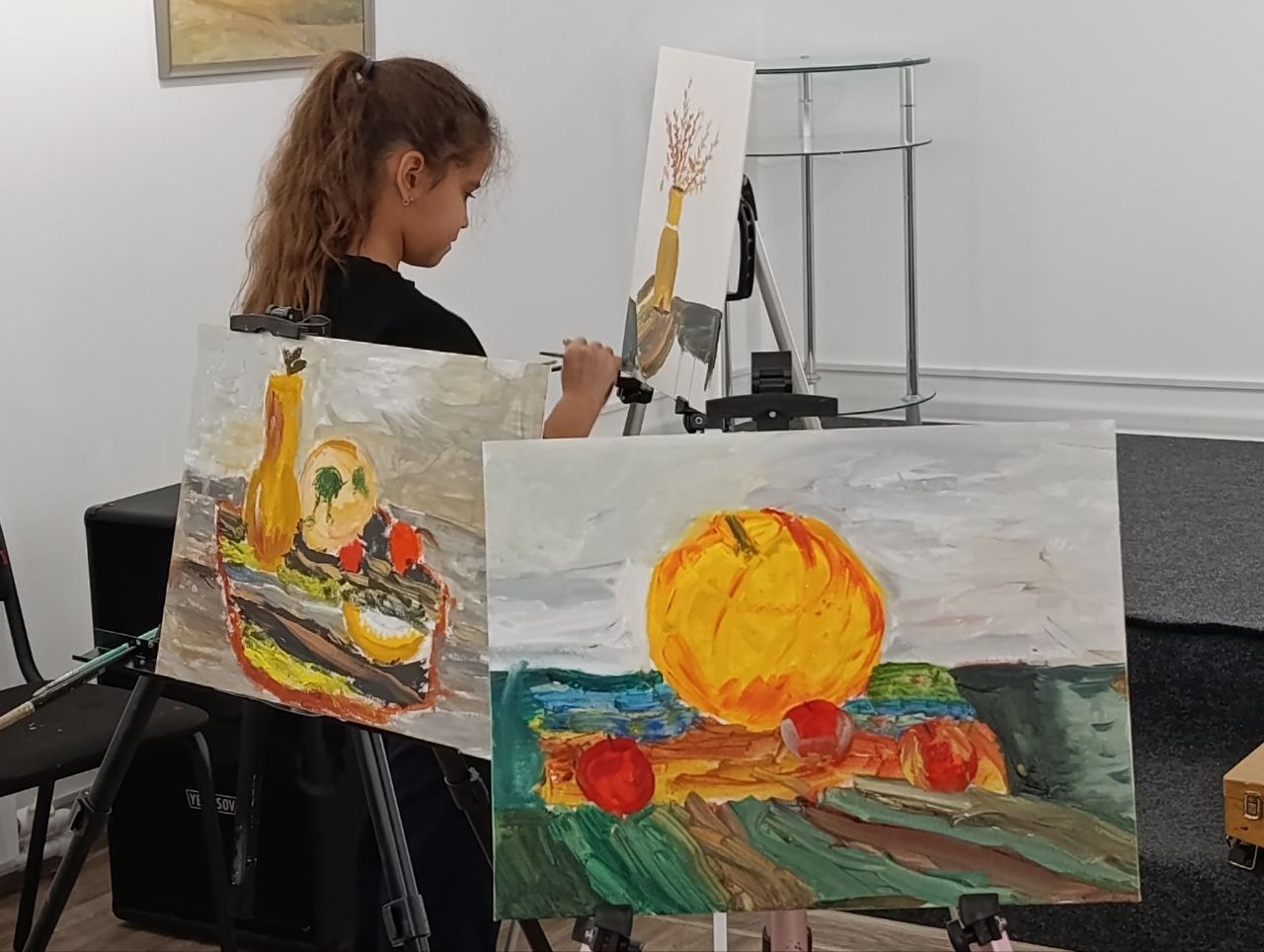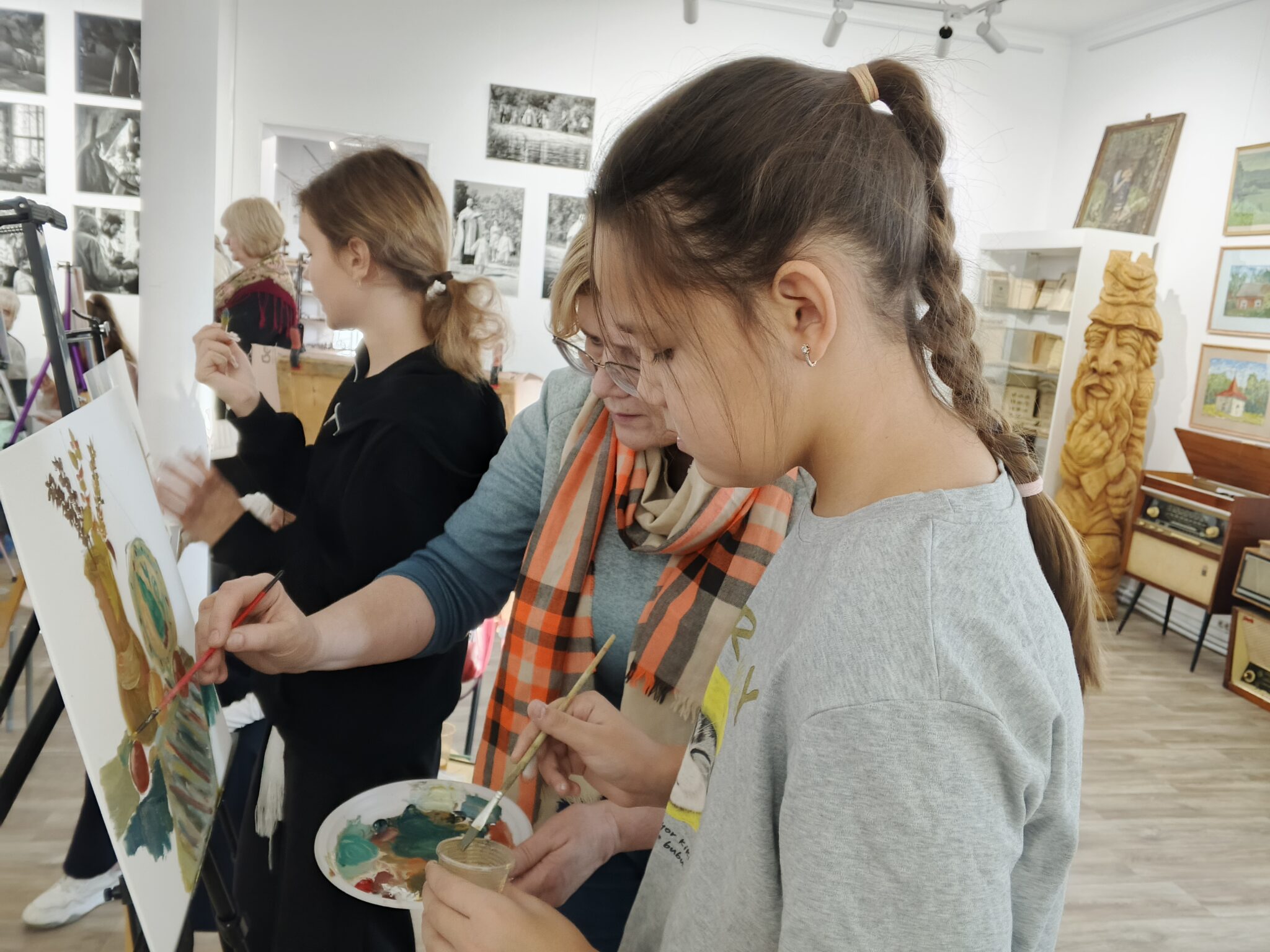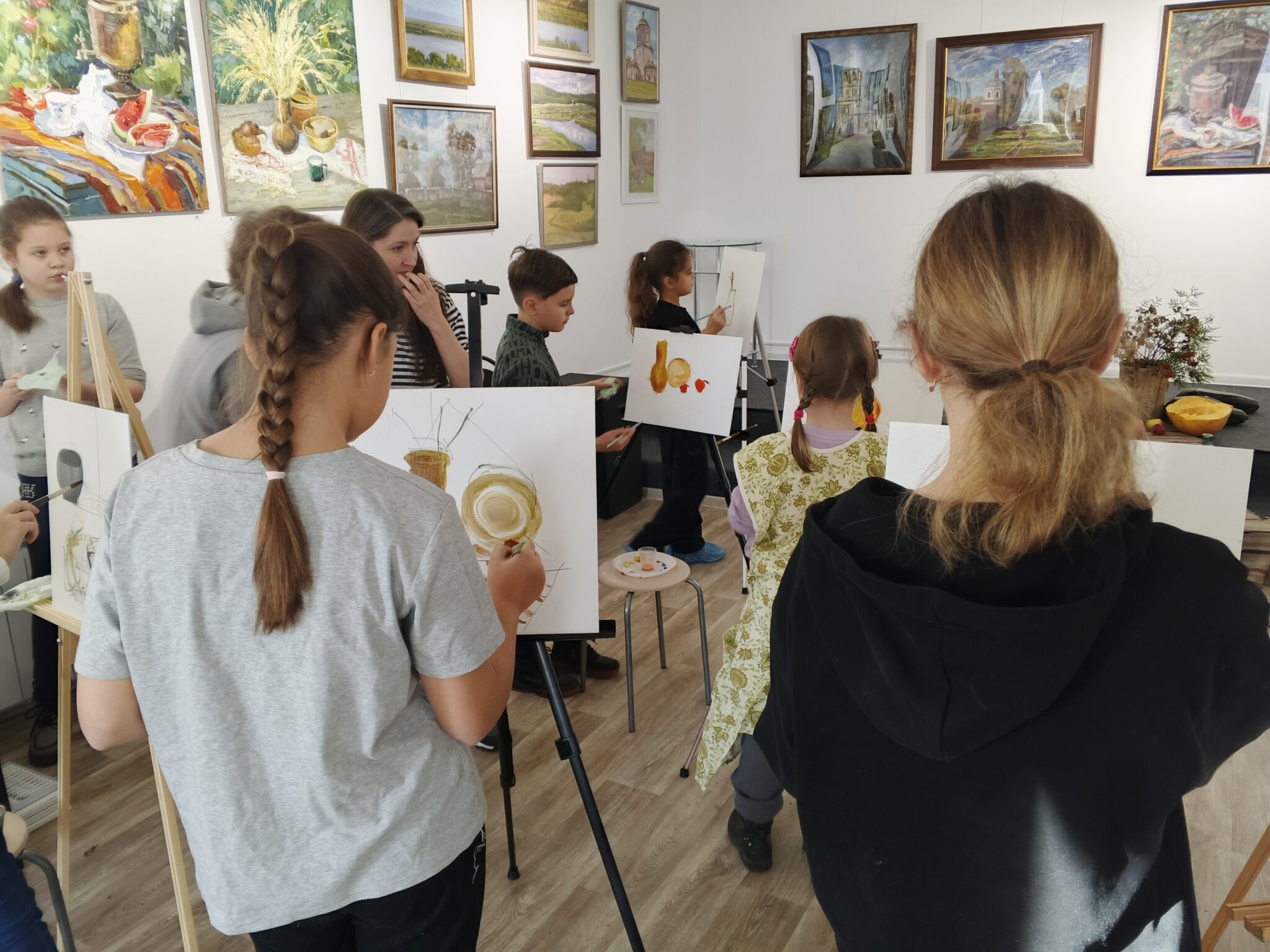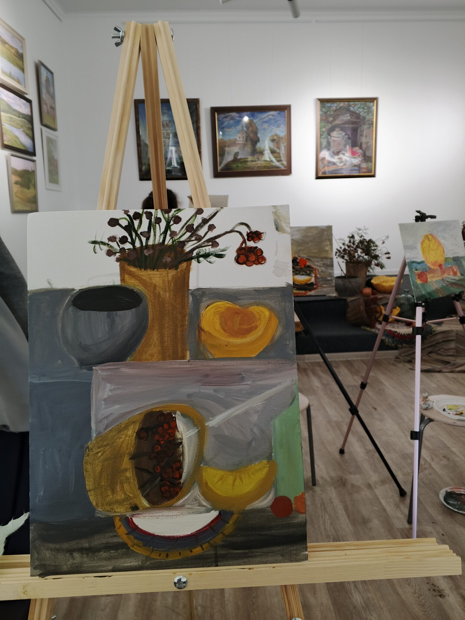Художницы провели с курмышскими ребятишками и гостями из города Сеченово, которые как раз в это время заглянули в музей, осенний мастер-класс. Писали маслом натюрморт с тыквами, гранатами и прочей красотой.