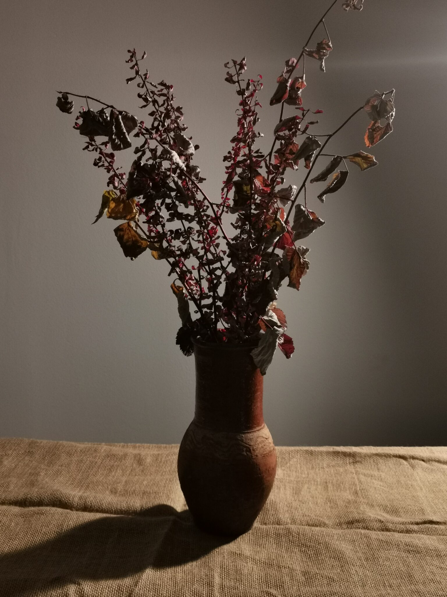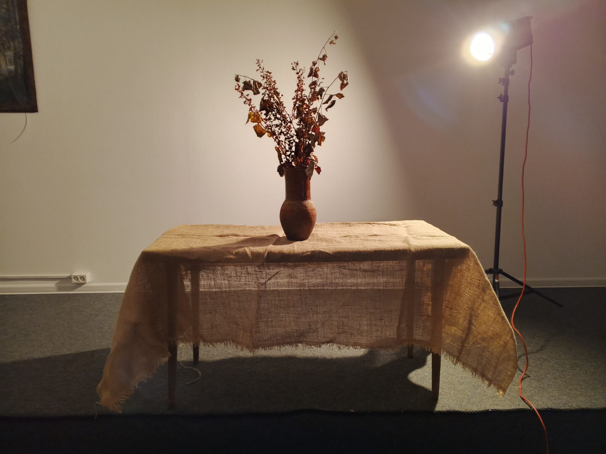 Для натюрморта качестве объектов выбирали разные предметы из нашей музейный коллекции: фотографировали кувшин с сухоцветами, бутыль из тёмного стекла, учась воплощать в кадре не только её фактуру, цвет и форму, но и содержимое, а потом создали более сложную композицию со старинной книгой, часами, очками и глиняным горшком.