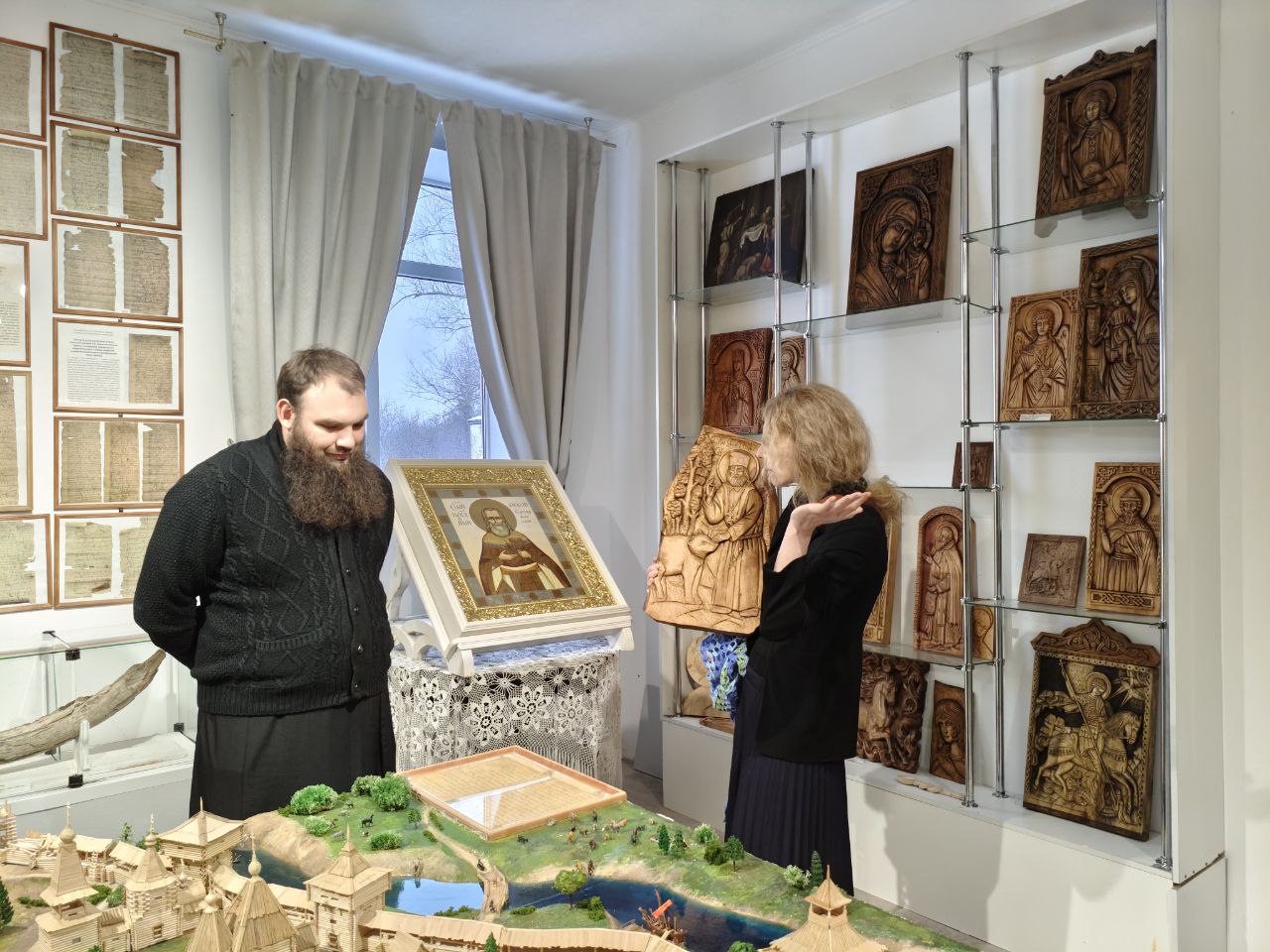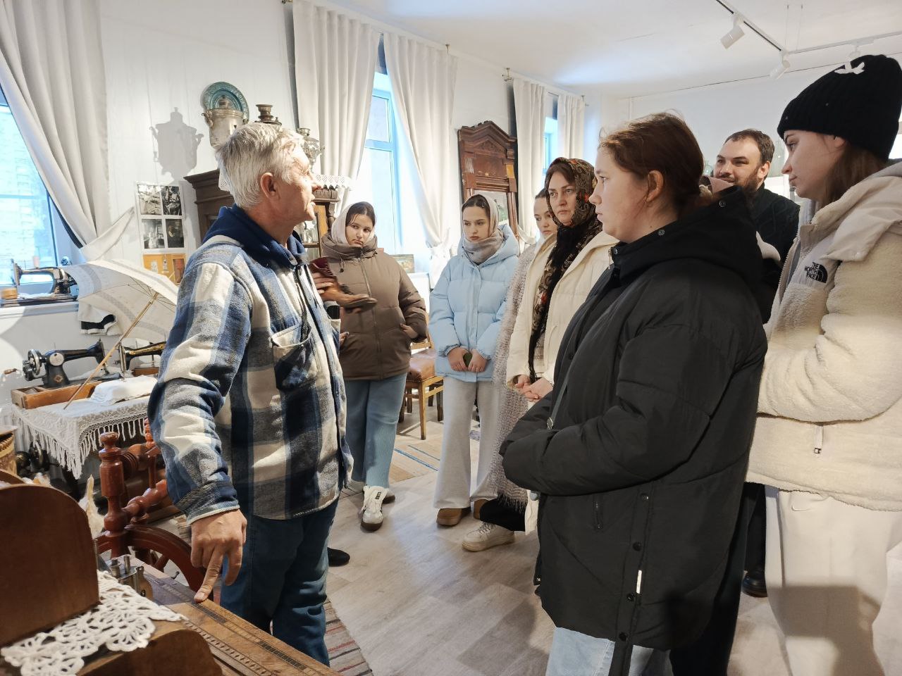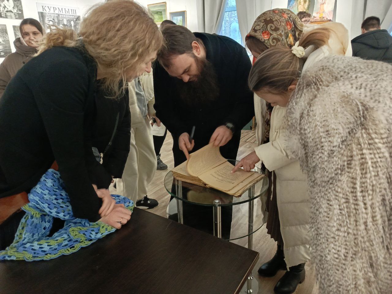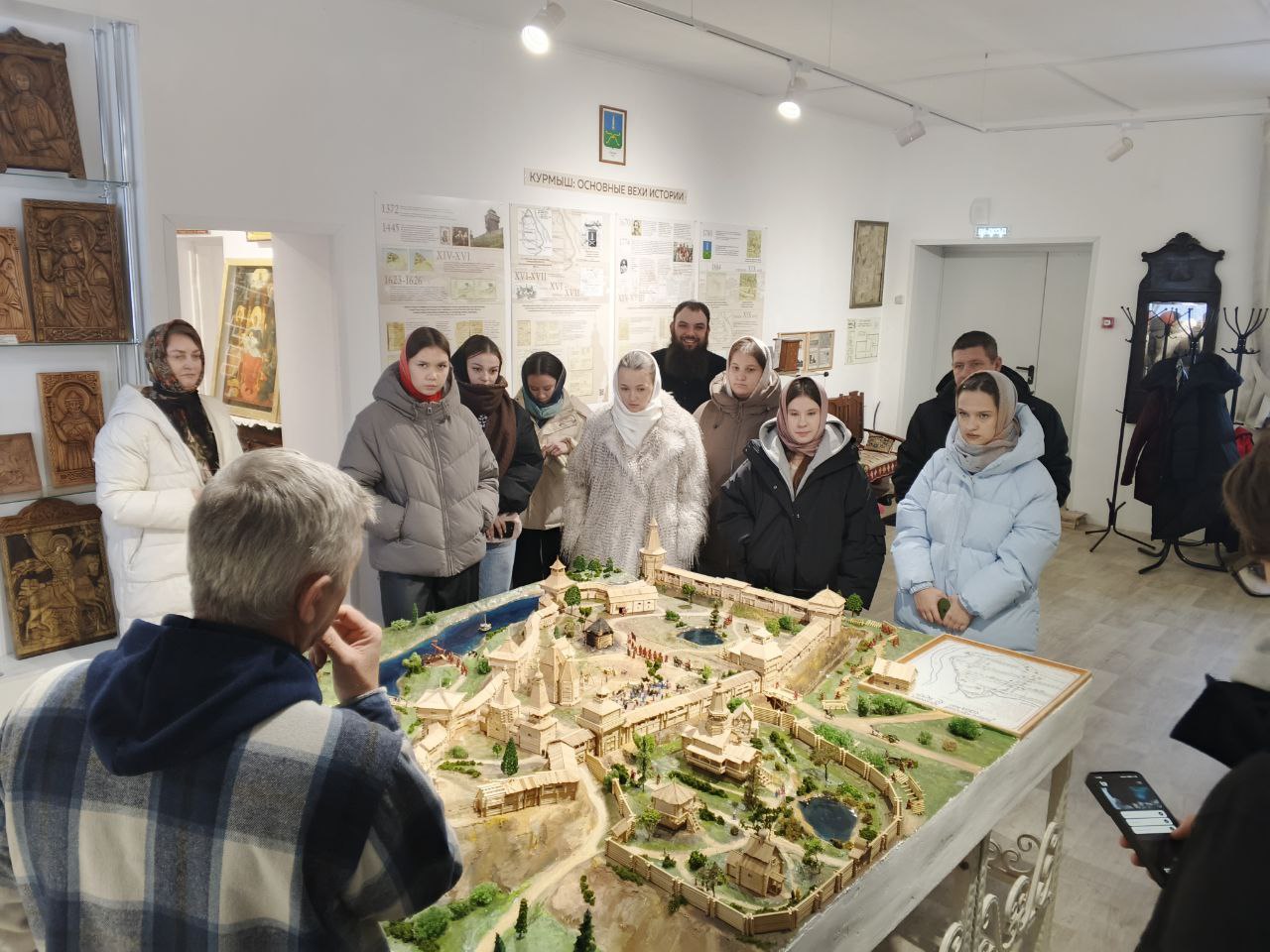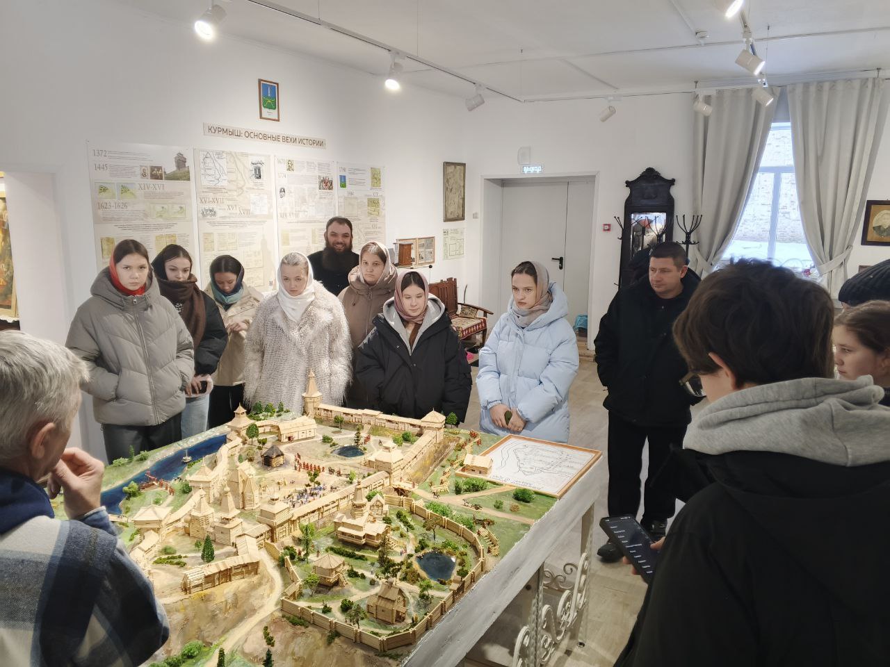 Общение получилось насыщенным: экскурсия охватила житие св. Алексия, историю села Бортсурманы, его святых заступников, священномучеников, храмостроителей и благодетелей, а потом снова покатилась вглубь веков, дотянулась до Великих князей и самозванцев, до летописей и писцовых книг, до устройства курмышской крепости, монастырей и храмов, а дальше – жизни уездного города и знакомства с экспонатами музея. Особенный интерес вызвала старинная кулинарная книга с рецептами всевозможных экзотических блюд, которыми в XIX веке хозяйки потчевали гостей и домочадцев. Как водится, ребята не могли оторваться и от макета старинного Курмыша, заводили патефон и изощрялись в каллиграфии, обмакивая в чернила старинные перьевые ручки.